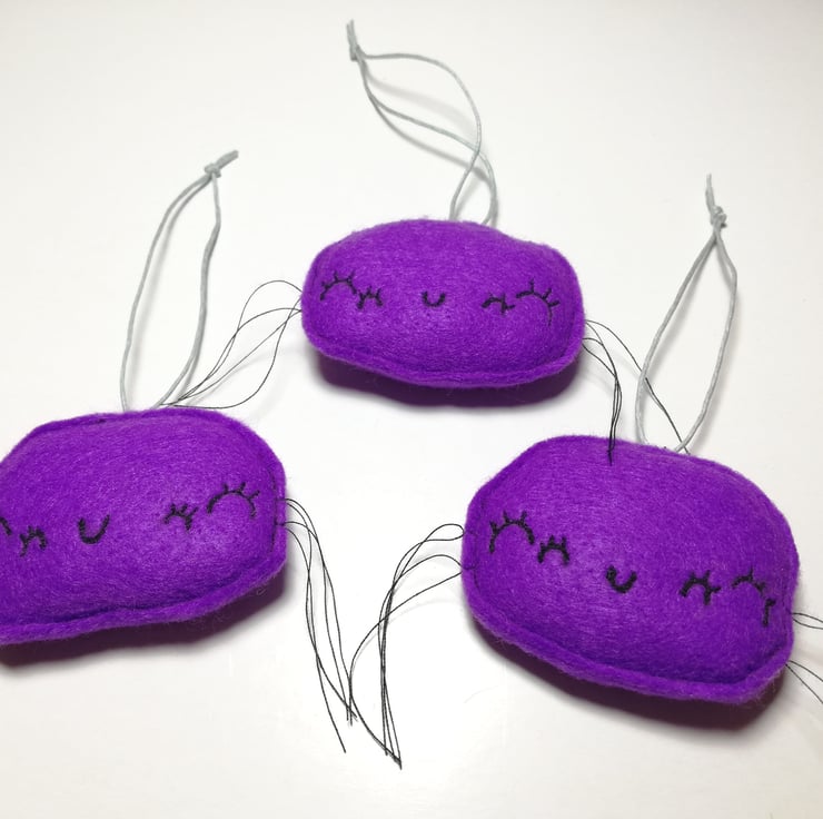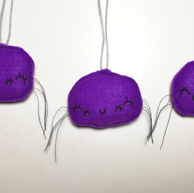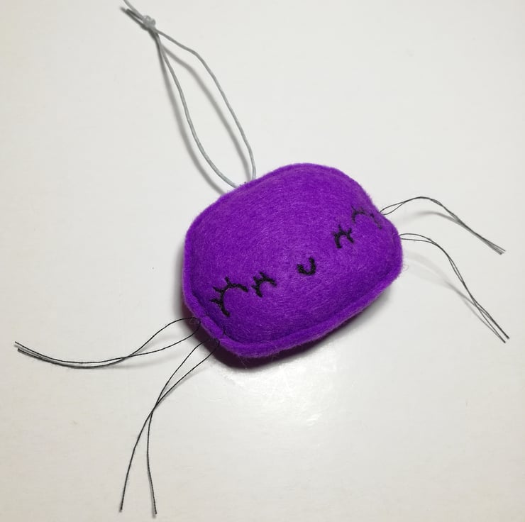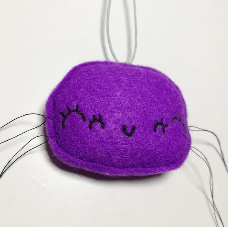 Cute and pretty spider with machine embroidered details including four eyes and mouth. Spider is made from purple felt with thread legs and wax thread grey hanger. Spiders measure roughly 6cm across and have raw edging. This listing is for one spider.