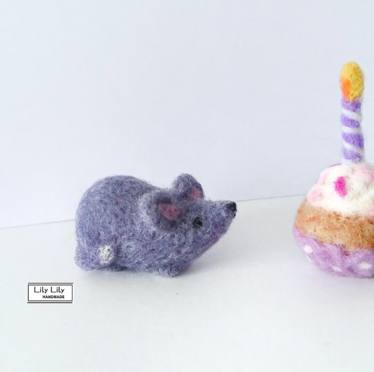 A cute small grey mouse/rat, needlefelted by Lily Lily Handmade. A sweet one of a kind felted collectable, which is ornamental or a lucky mascot. The little grey mouse is called Gabriel and loves cake.