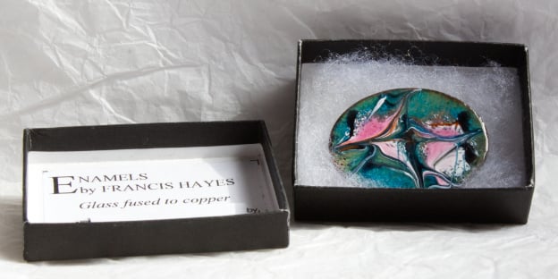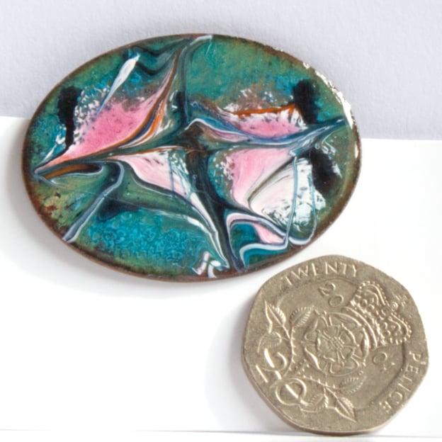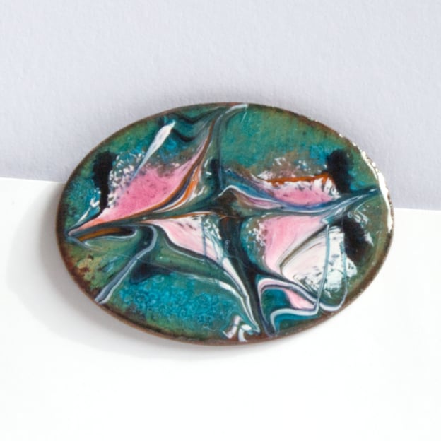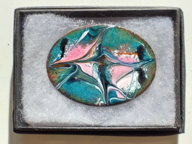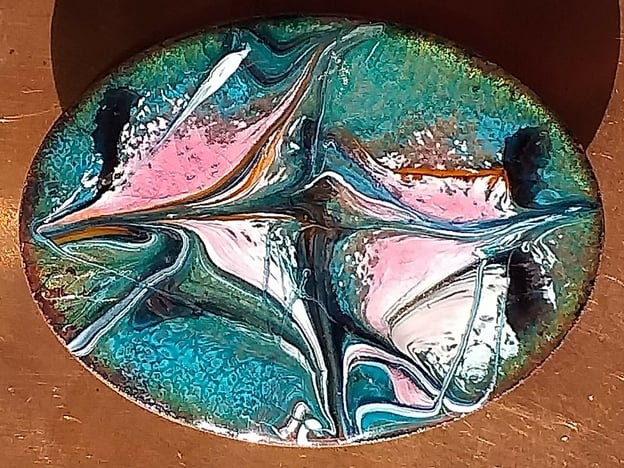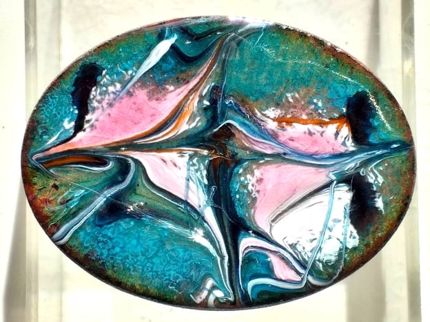 On a base of clear enamel on the copper oval, I have added a blue-green layer. The copper beneath shimmers through the green. I then scattered pink and white enamel powder, added lengths of back enamel rod, and drew through the red hot surface to create the unique, random pattern you see.
