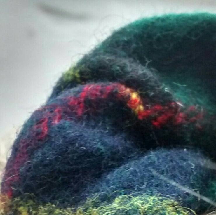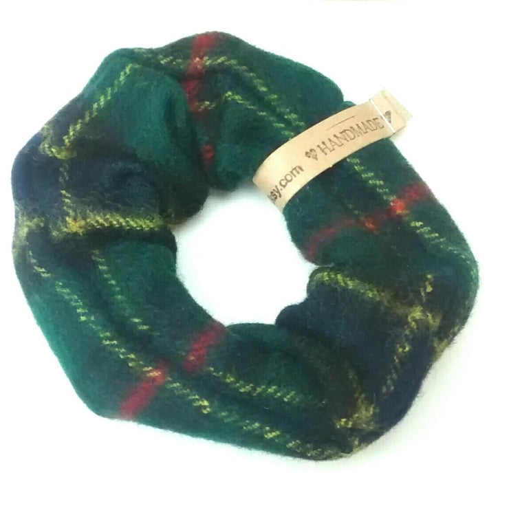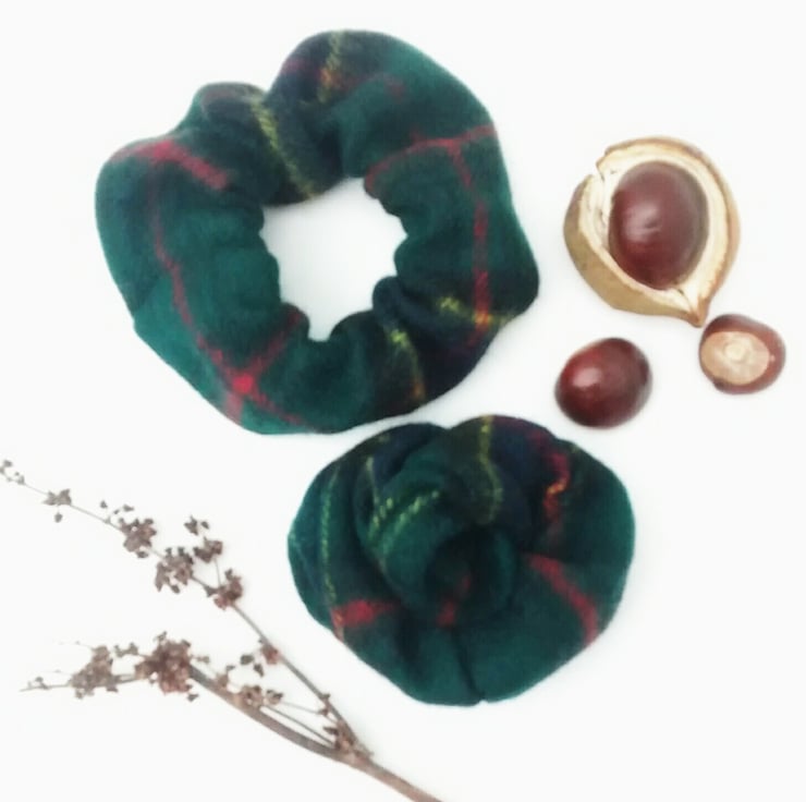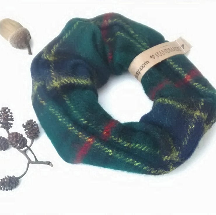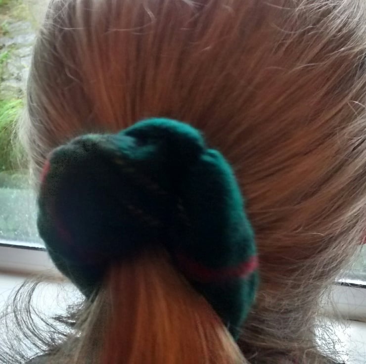 A hair scrunchie, handmade from a wool scarf which has been felted by a washing process.