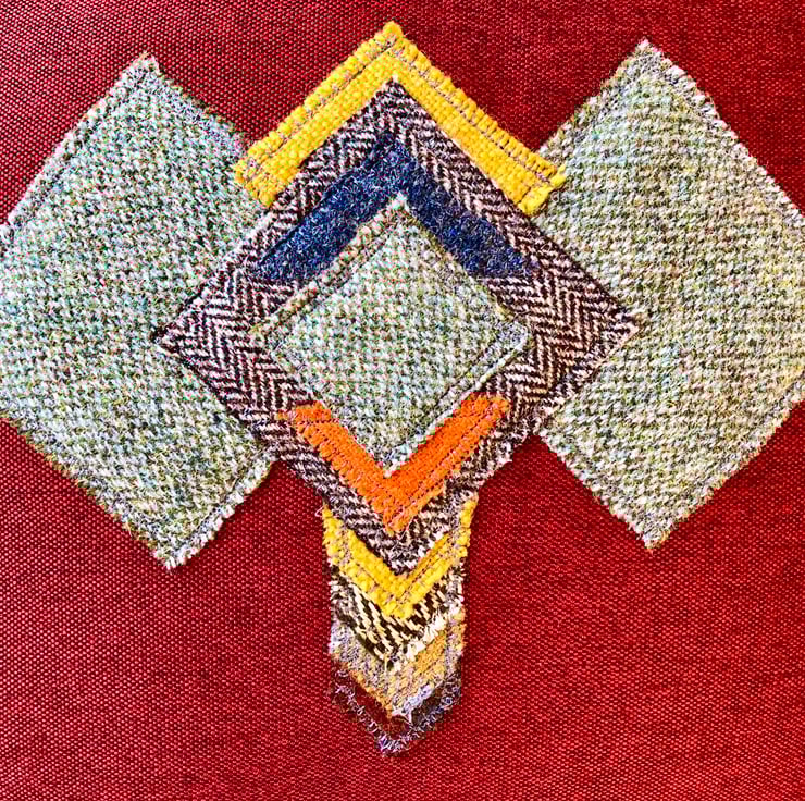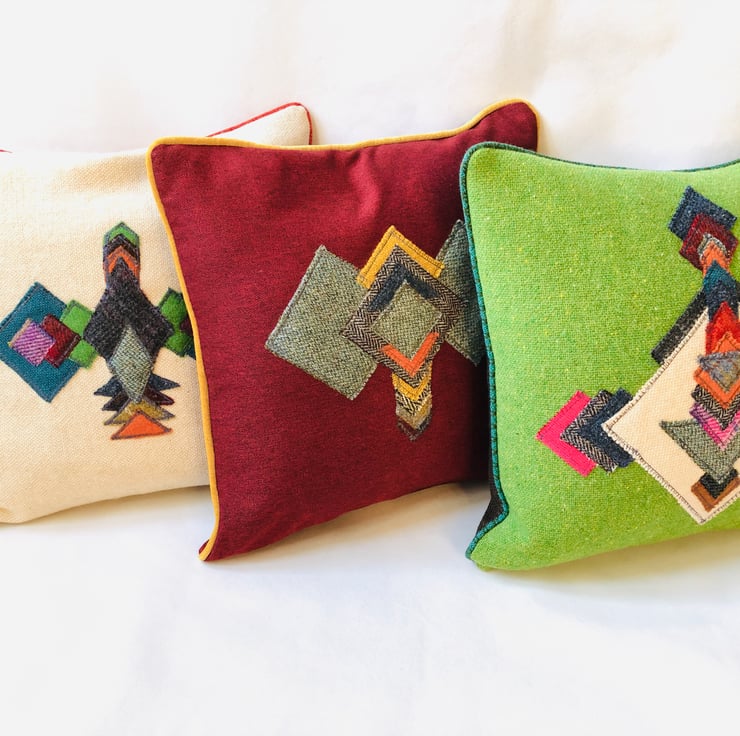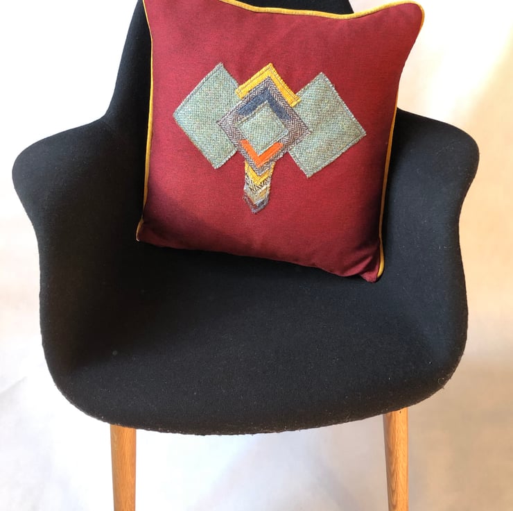 This is a very stylish cushion made using good quality modern fabrics with geometric appliqued motifs inspired I the shape of an elephant. The appliqué detail has been made using Harris tweed and Bute woolen pieces over a burgundy cotton mix material. This fabric is also used on the other side. It also has piping in a beautiful contrasting bright yellow velvet material.