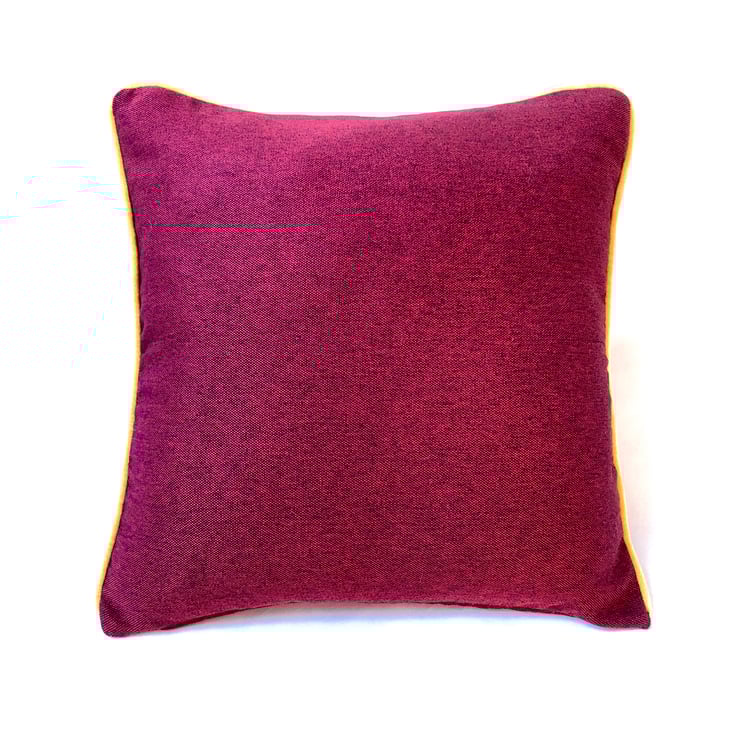 This is a very stylish cushion made using good quality modern fabrics with geometric appliqued motifs inspired I the shape of an elephant. The appliqué detail has been made using Harris tweed and Bute woolen pieces over a burgundy cotton mix material. This fabric is also used on the other side. It also has piping in a beautiful contrasting bright yellow velvet material.