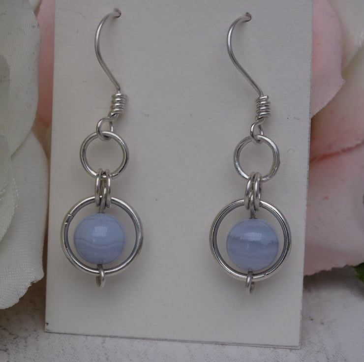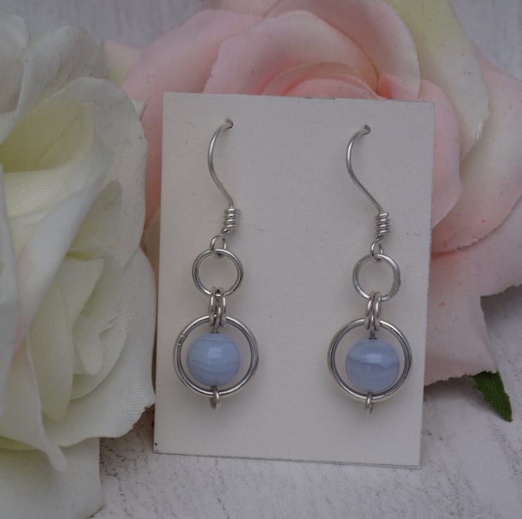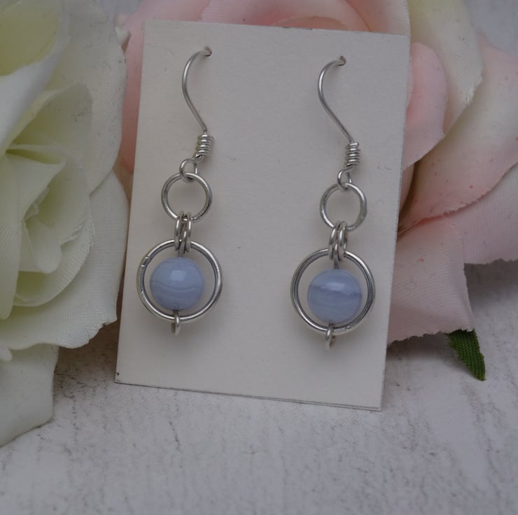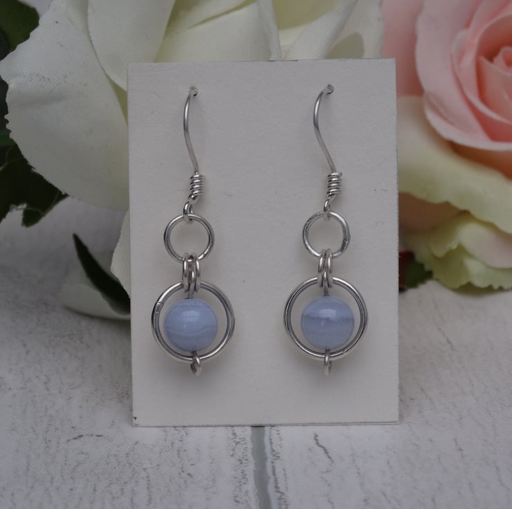 Part of the Circles collection, these blue lace agate earrings consist of an 8 mm blue lace agate gemstone bead encased in a 10 mm sterling silver circle. Smaller sterling silver rings connect this to a 6 mm sterling silver circle, which then hangs from the handmade sterling silver ear wire.