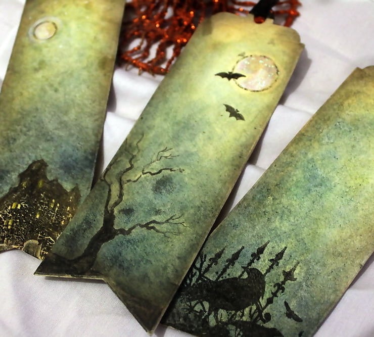 Just perfect for Halloween, a set of three bookmarks, great for party favours or as a gift, each one is stamped (not computer generated) with the illustrations of trees, bats, full moons ravens and a haunted house.