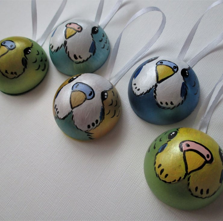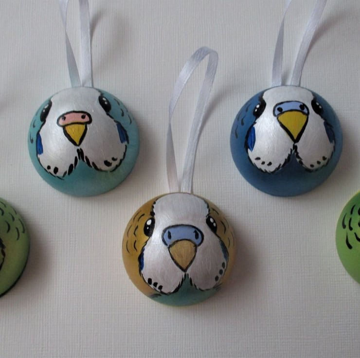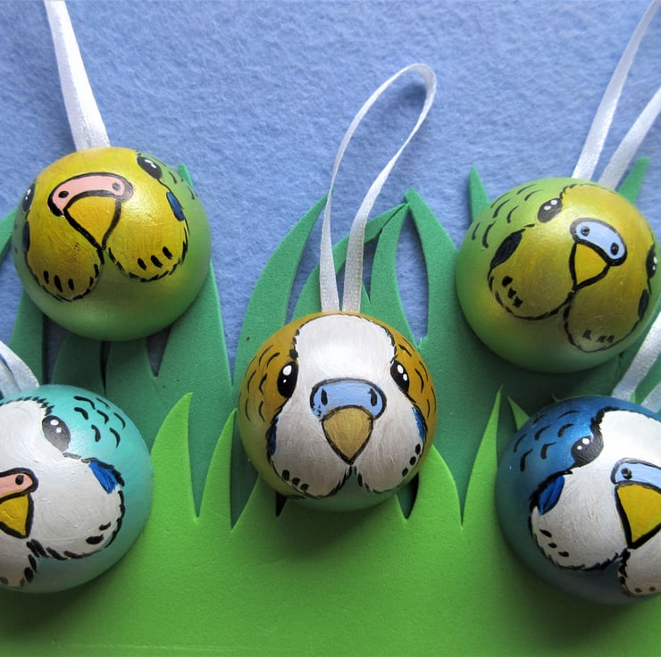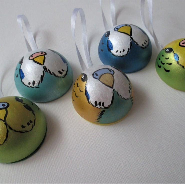 Budgerigar hanging decoration / Christmas bauble x 5 (five) in a mixed set of colours.