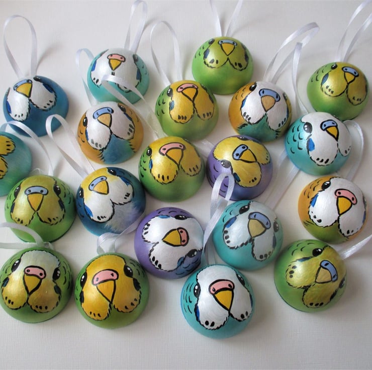 The budgies are painted in acrylic paints with felt backing on the flat side of the wooden ball.