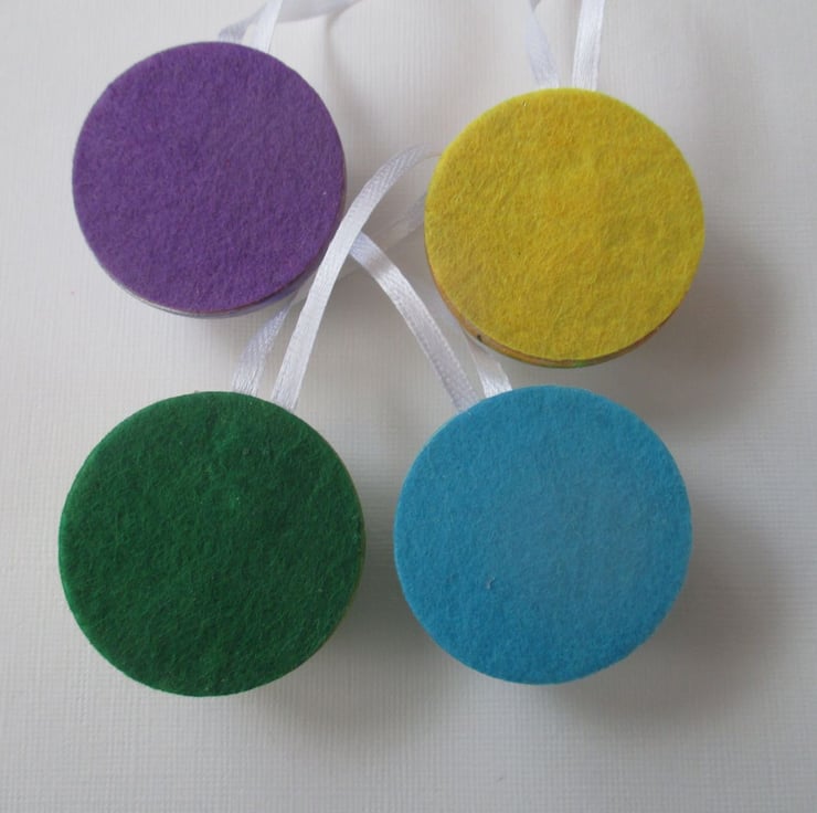 The baubles are 4cm / 40mm diameter, and are flat on the back. Each bird has a length of ribbon attached to hang it by.