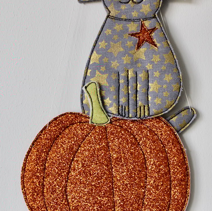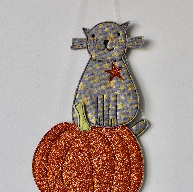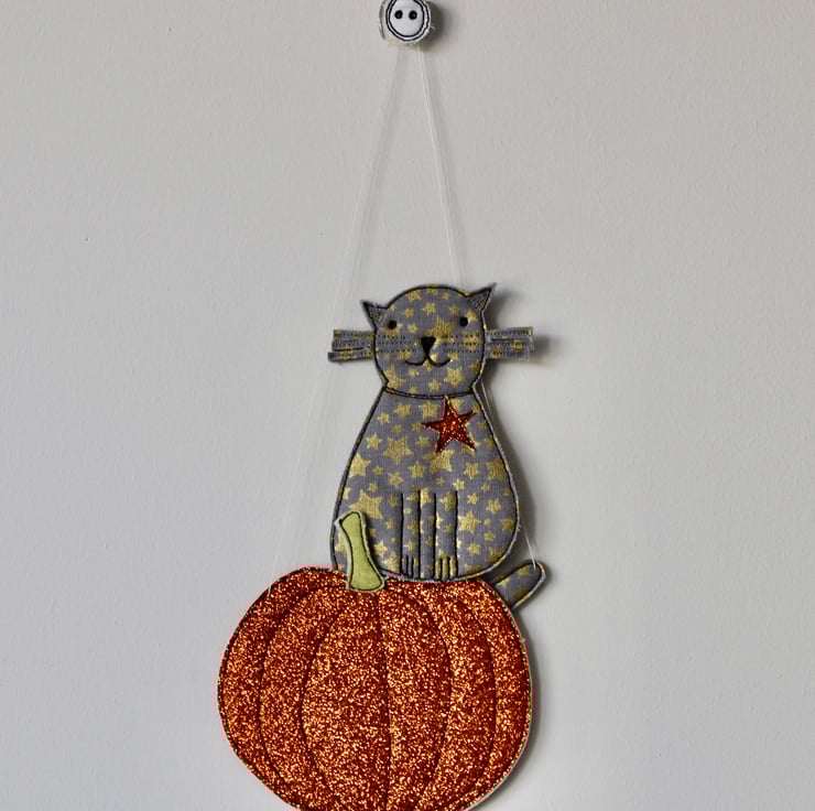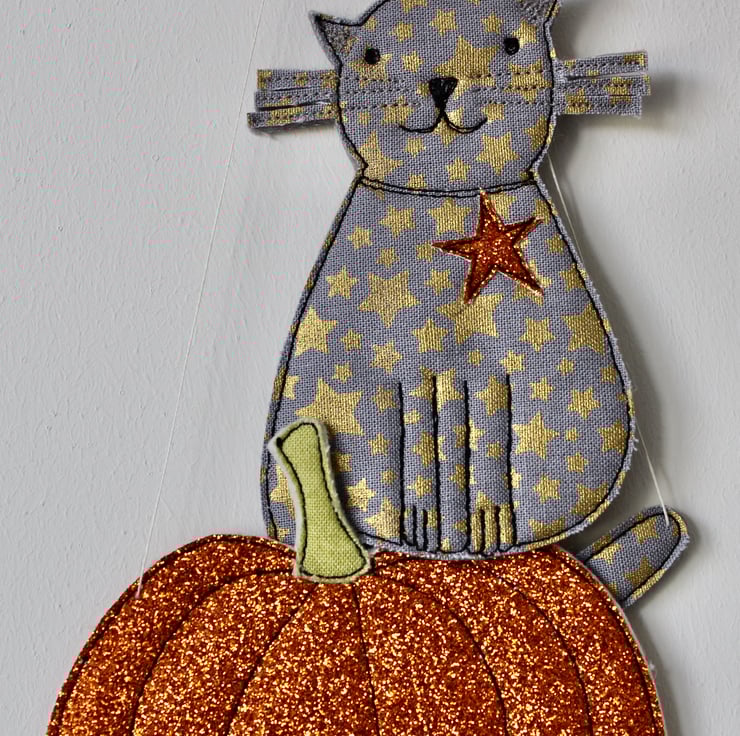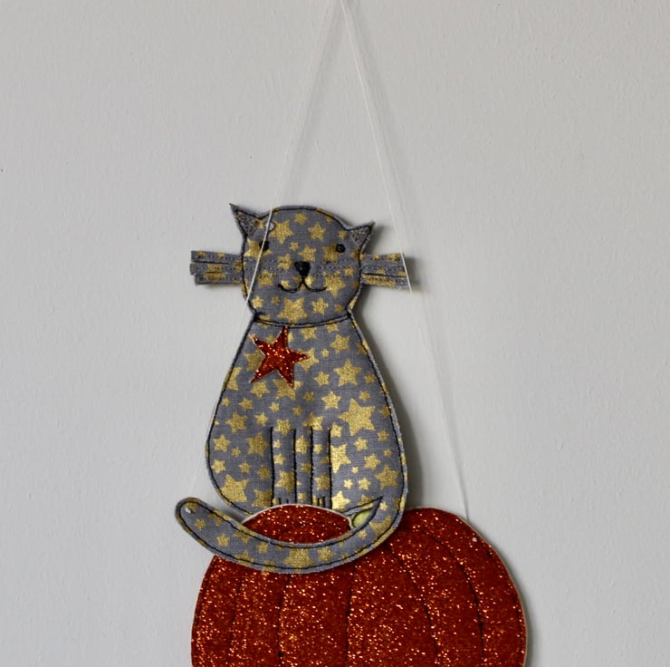 Little cat and pumpkin are sewn using cotton cloth, 100% wool felt, glitter cloth and free hand machine embroidery; multiple layers of cloth are sewn together and cut out by hand using very sharp scissors. With a linen string to suspend.