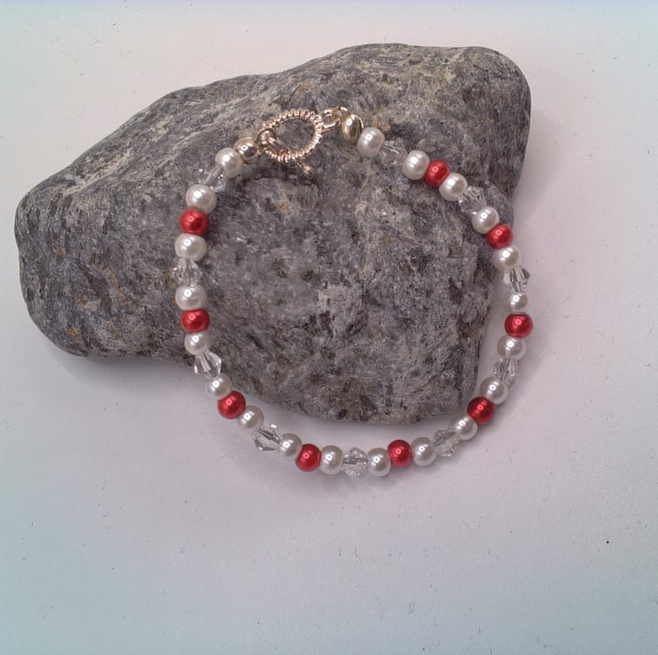 This pretty bracelet for a child would look great for your bridesmaids or flower girls, or for a young girl for their prom night. The bracelet is made using 4 mm white and red pearls and 4 mm clear crystal bicone beads. It measures 15.25 cm (6 inches) long and it has a silver plated toggle clasp. There are two bracelets available. The bracelet will be dispatched wrapped in tissue paper in an organza bag and delivered to you via Royal Mail first class post.