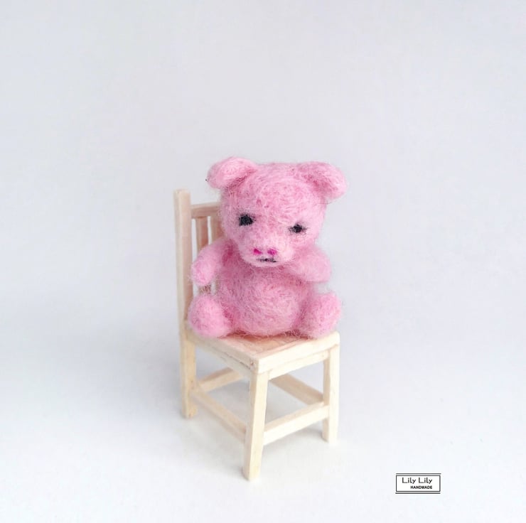 The little piggy has been needlefelted by hand using soft unspun merino wool fibres. The wool is stabbed with a very sharp barbed needle to twist the individual fibres to sculpture into shape. The piglet is very small, measuring approximately 2.7cm in height. The miniature chair in the photo is not provided. Supplied wrapped in tissue paper with a pretty ribbon tied organza gift bag.