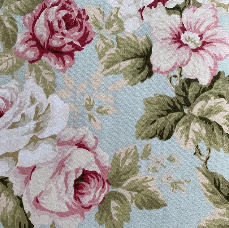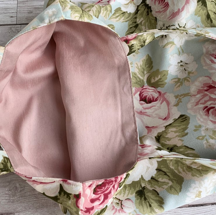 A handy tote bag in a pretty pastel floral print fabric. The pattern features a profusion of roses and other summer flowers in pastel shades of pink and white, with green foliage on a pale duck egg blue background. The bag is lined with pale dusky pink fabric with a slight sheen.