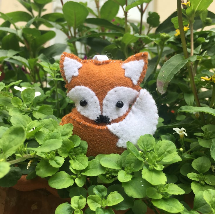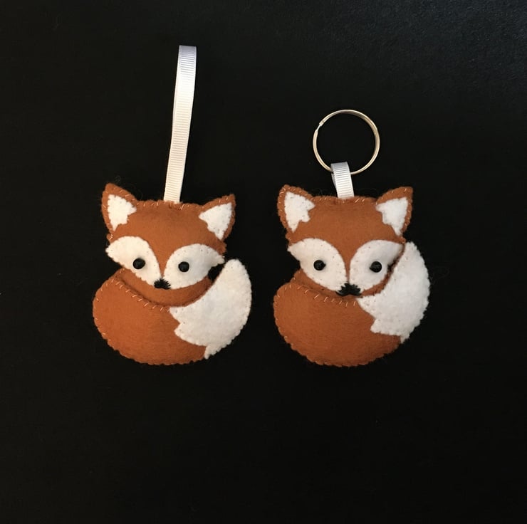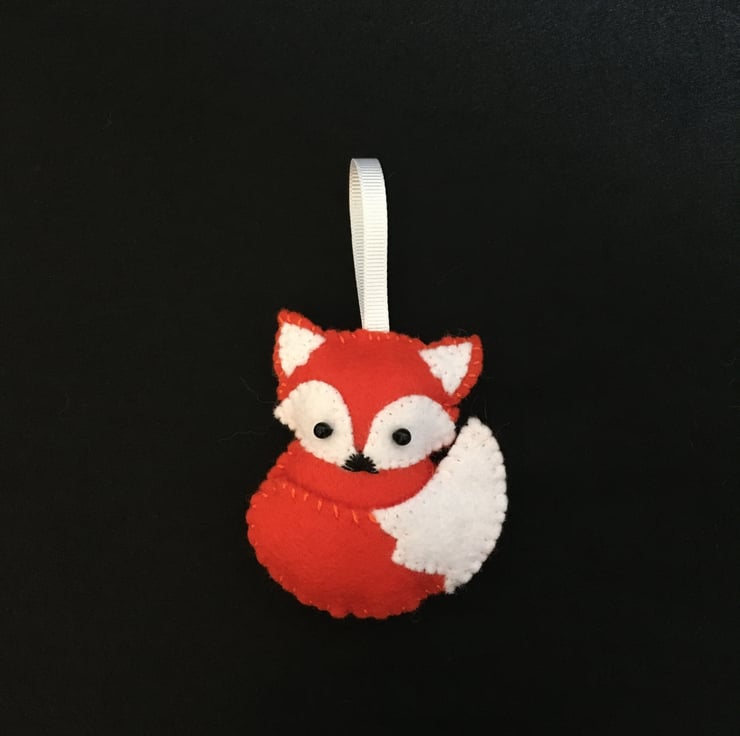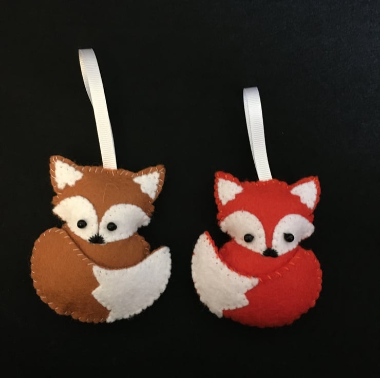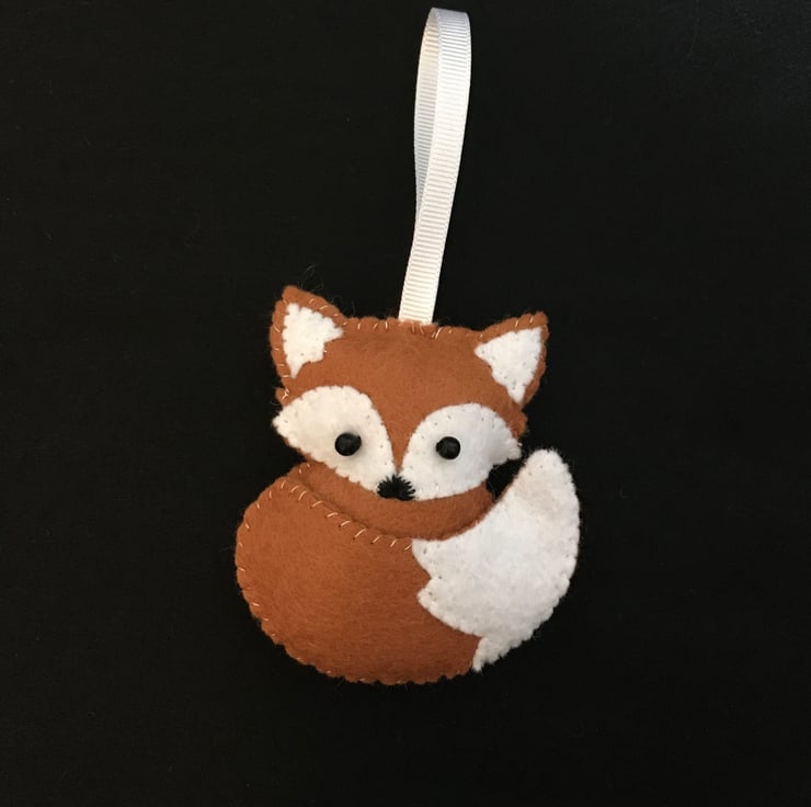 A cute handmade and hand sewn brown felt fox hanging ornament. The fox has been embellished with beaded eyes and an embroidered nose.