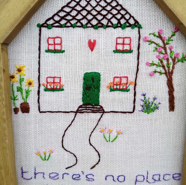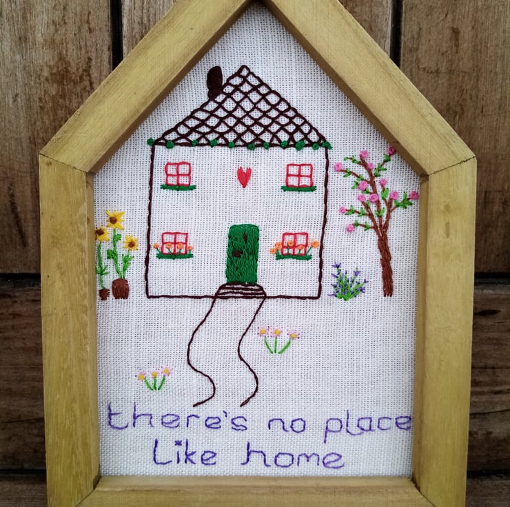 Hand embroidered picture of a pretty little house set in a cottage garden, with sunflowers, a cherry tree, lavender bush and flowers. The downstairs windows have tiny window boxes too. Framed in a house shaped wooden frame measuring approximately 14.5 cm wide and 21 cm high. There’s no place like home. Handmade in Wales. Please allow 14 days for delivery given the current circumstances. If you need an earlier delivery, please message me and I will do my best to help.
