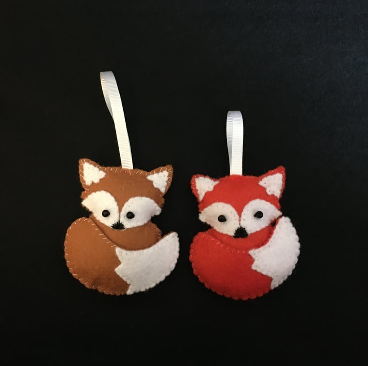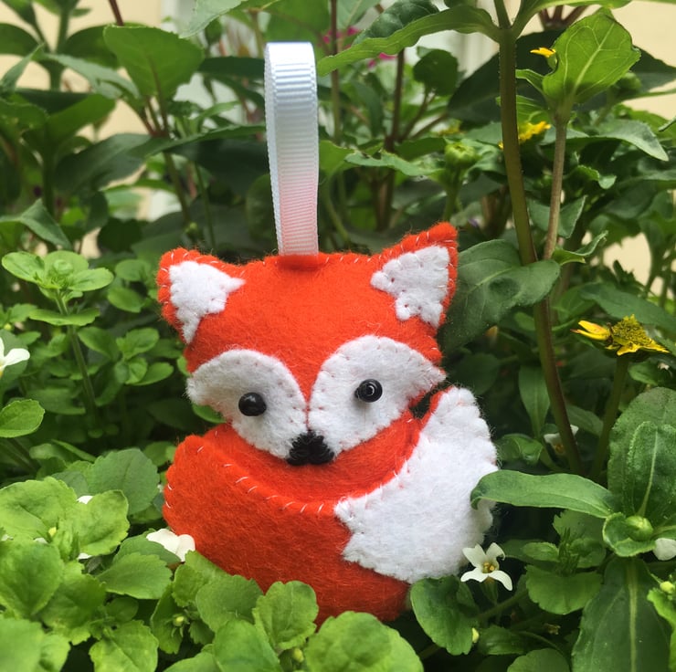 A cute handmade and hand sewn orange felt fox hanging ornament. The fox has been embellished with beaded eyes and an embroidered nose.