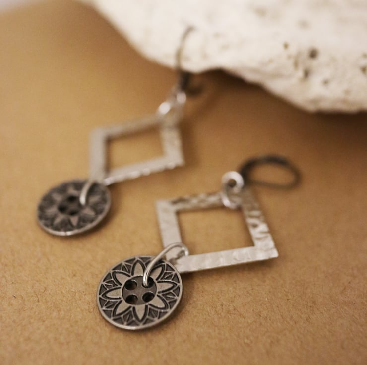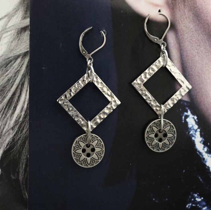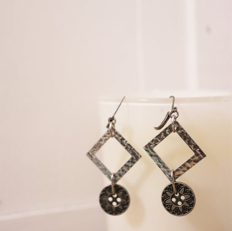 Up-cycled square shaped stainless steel and gun metal color metal vintage button earrings