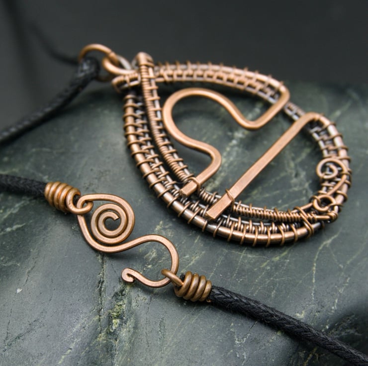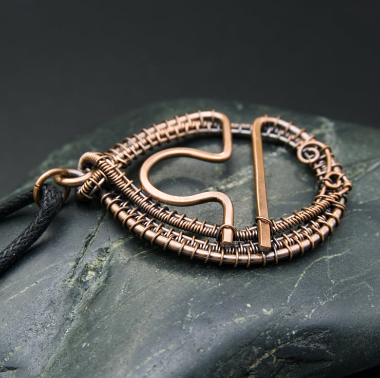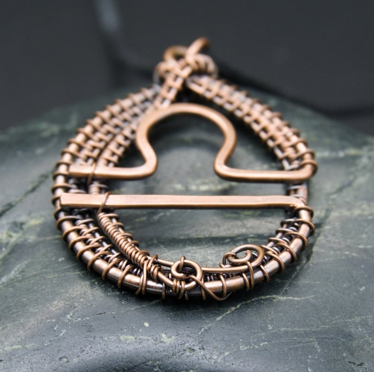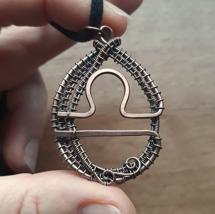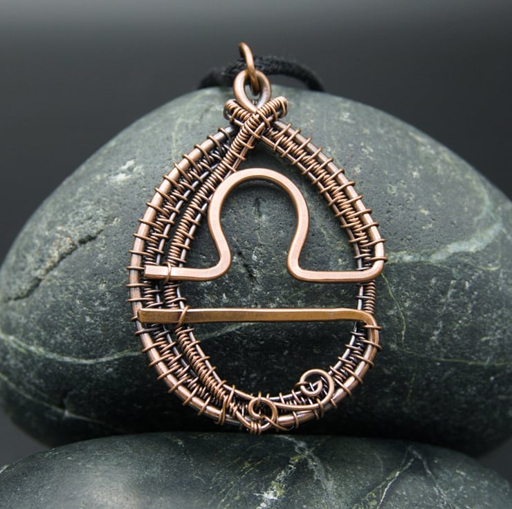 This unusual zodiac pendant is made entirely from copper wire. I've hammered thicker wire into the Libra star sign symbol & created an oval frame for it. I've then woven finer wires around the frame, finishing with a couple of small swirls at the bottom of the pendant. I then oxidised & polished it, really bringing out the hammered copper star sign.