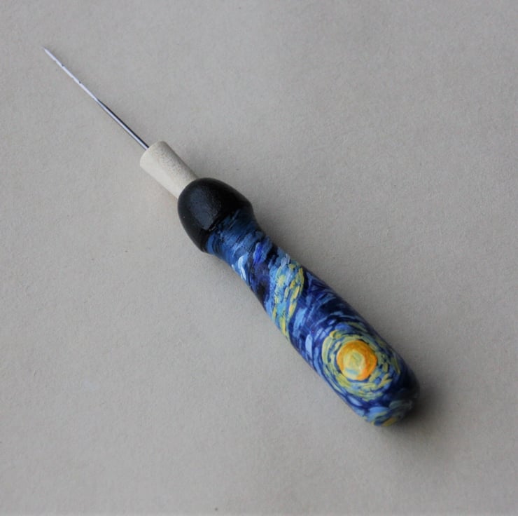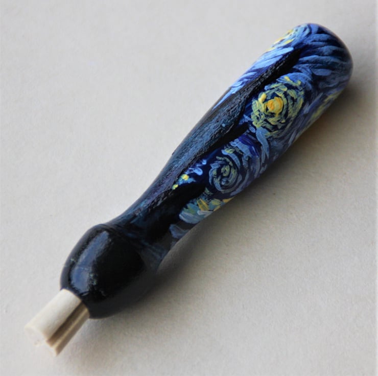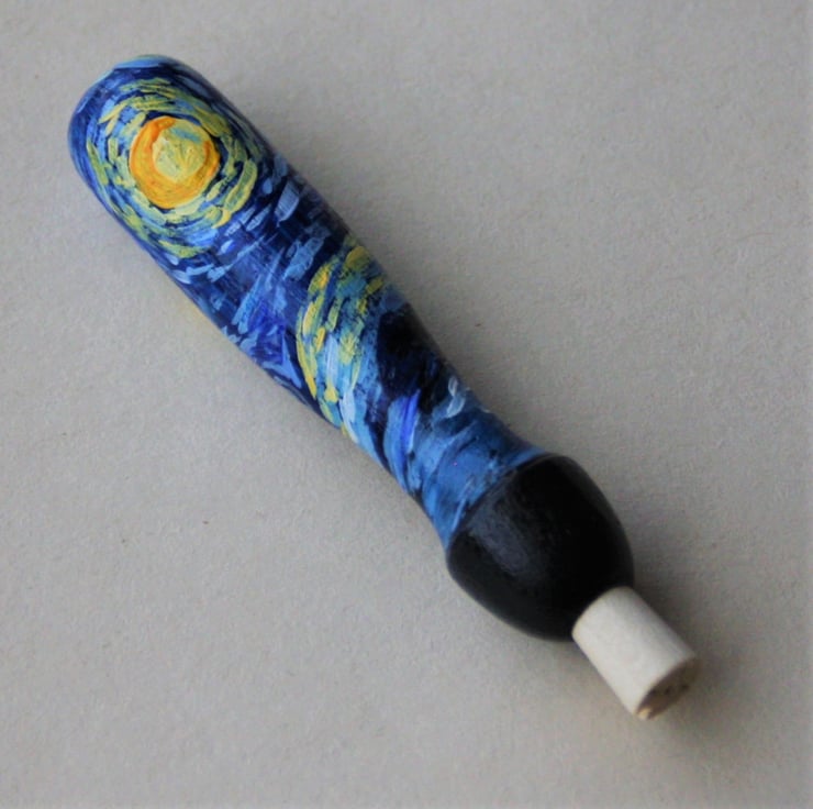 Inspired by Van Gogh's 'Starry Night', this hand painted, wooden needle grip holder, for use with needle felting needles, is decorated in the style of the painting. A perfect pressie for your felting friends or as a treat to yourself.