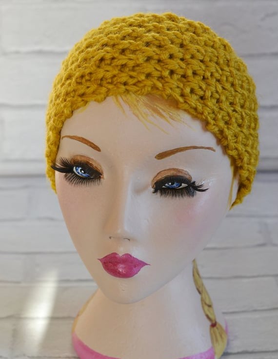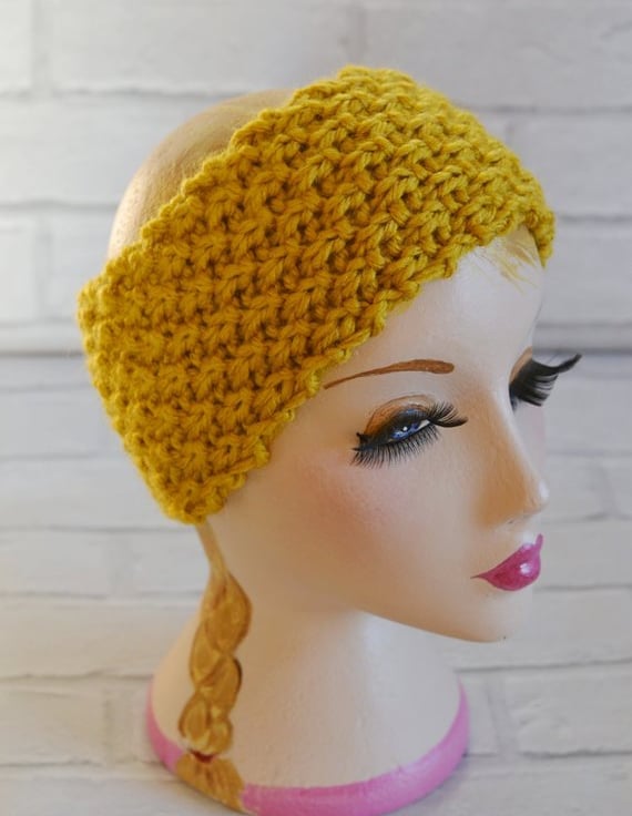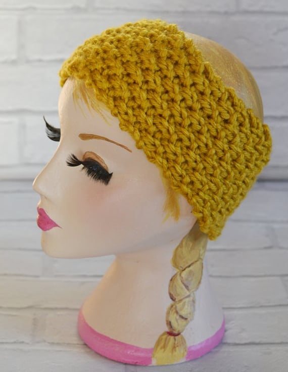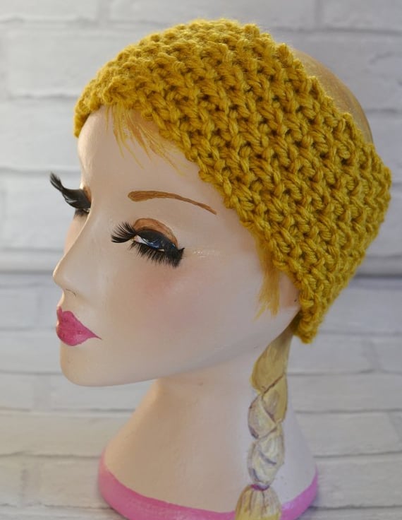 Mustard super chunky knitted wide headband earwarmer. It will fit heads 21" - 23"