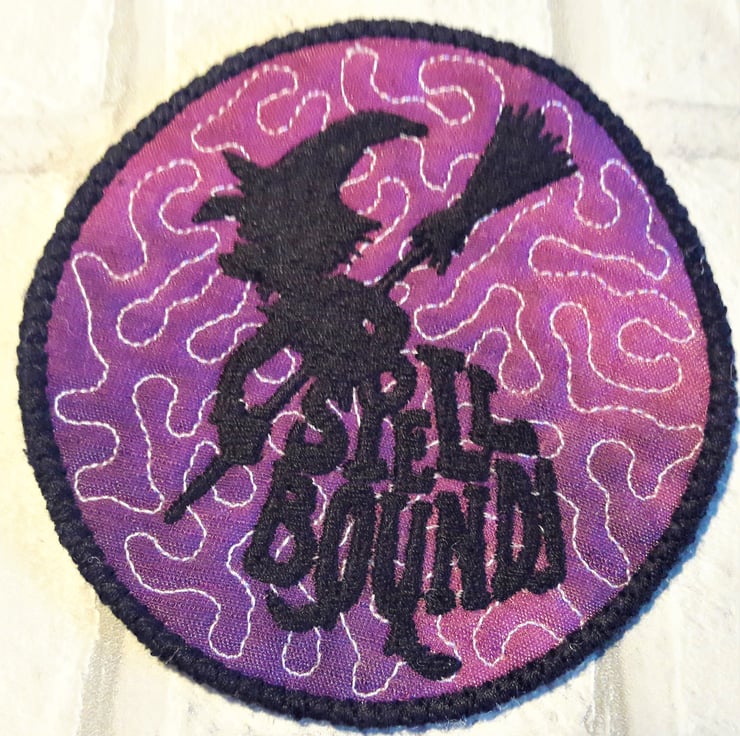 The coaster is made from a mottled purple cotton blend fabric with white quilted design. The picture detail is an embroidered black witch with the word SPELLBOUND. The coaster is edged in black. Back is plain.