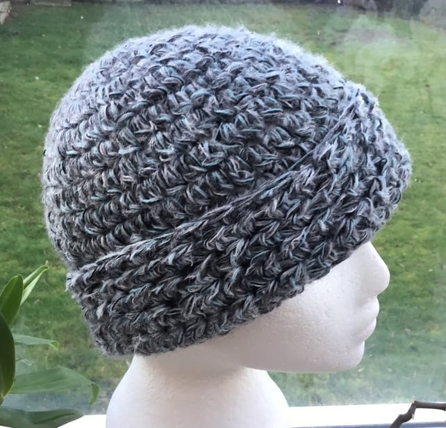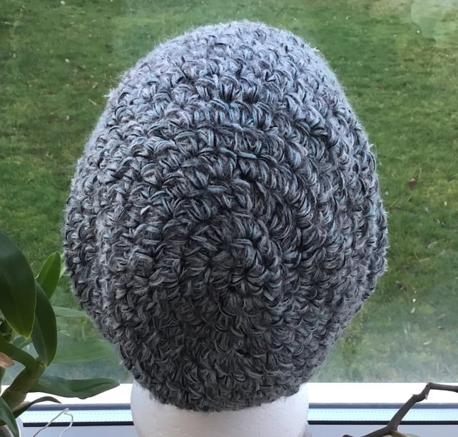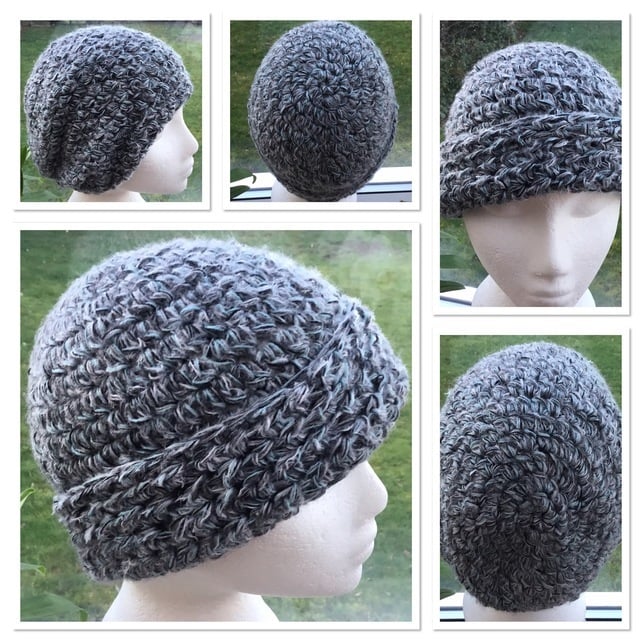 Triple Wave! A cosy multi toned beanie, soft beret or slouchy crocheted hat. Which could be worn in a variety of styles, as photographed. Crocheted in a blended 4 strand yarn, giving a mottled effect.