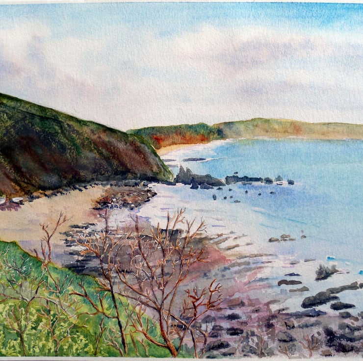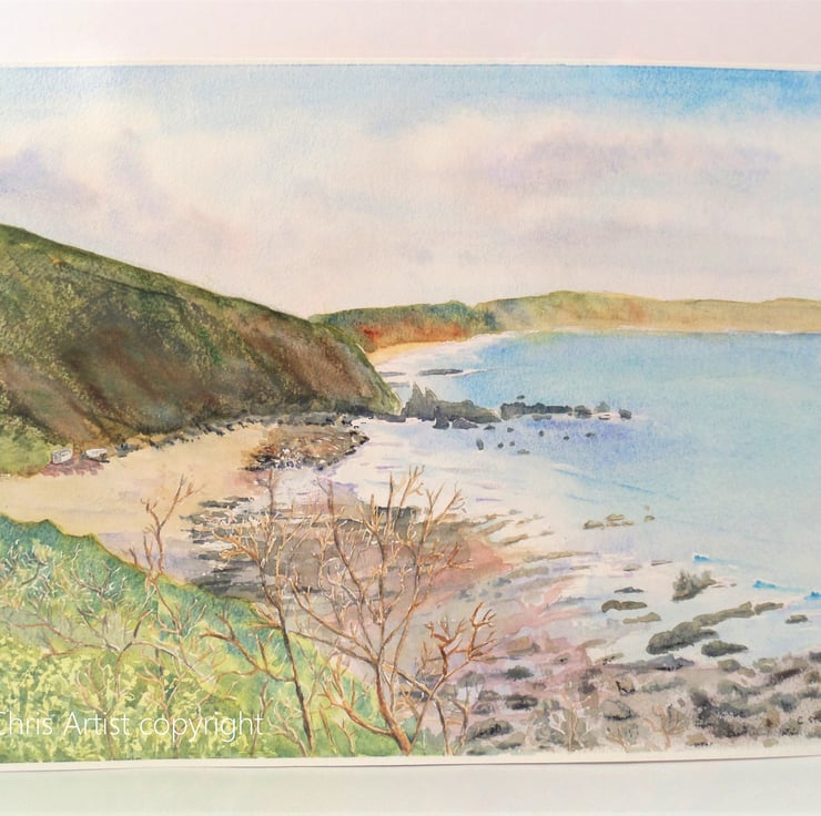 This A3 size mixed media landscape scene overlooks the beautiful Finnygook Beach at Portwrinkle in south east Cornwall. Based on my own photograph taken on a spring afternoon.