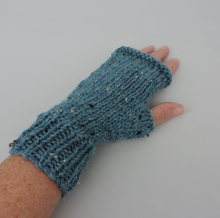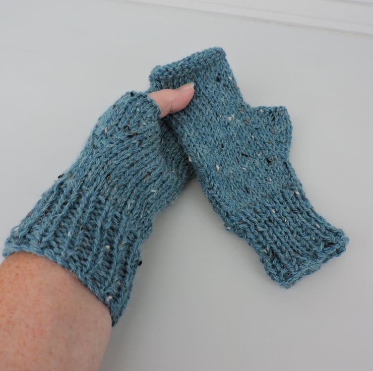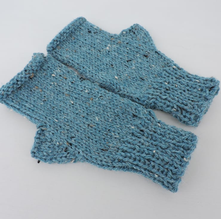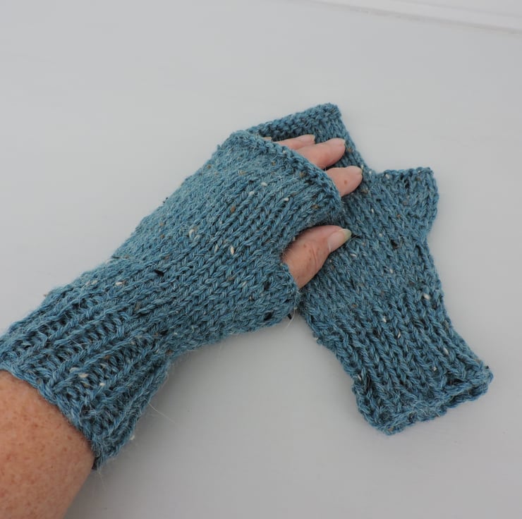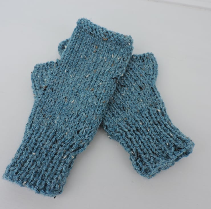 These fingerless mitts have been knitted in a soft and warm chunky alpaca and acrylic yarn. A rich turquoise colour with black and white tweedy bits throughout. Ribbed cuffs with a plain body. A cosy winter warmer.