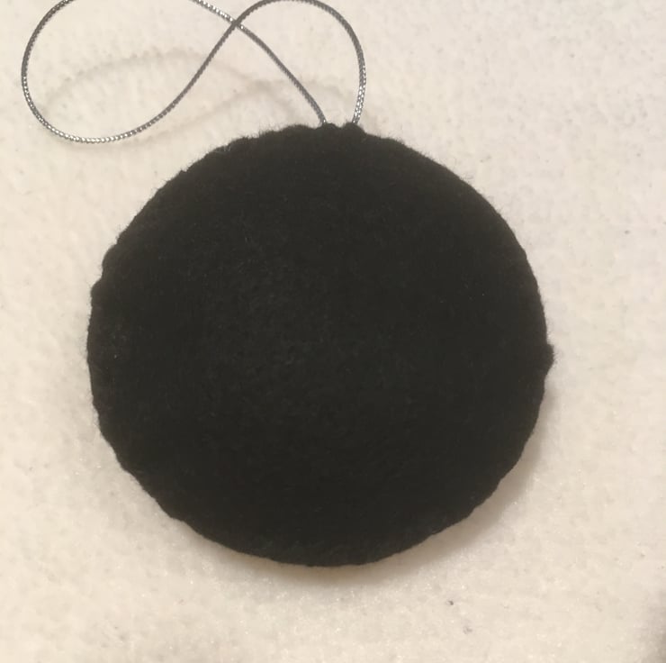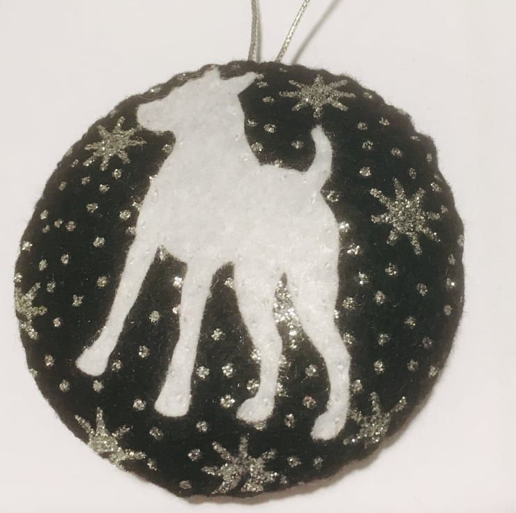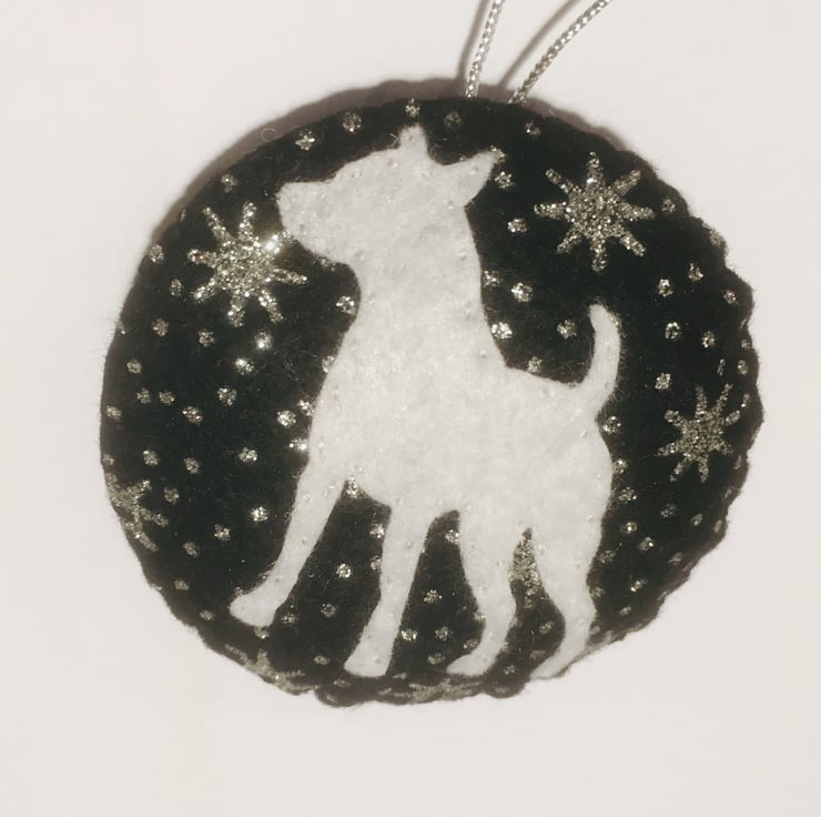 A lovely silhouette White Dog hand stitched on to a Black Sparkly felt bauble with printed sparkly silver stars.