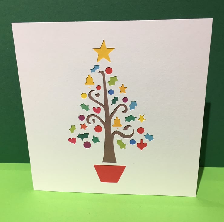 This pretty card features a paper cut Christmas Tree with coloured paper behind the detail.