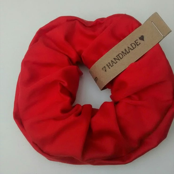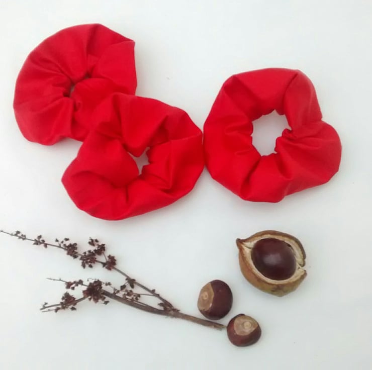 A hair scrunchie, handmade from a bright red cotton fabric remnant.