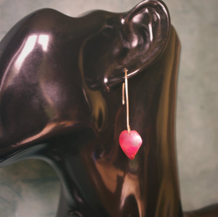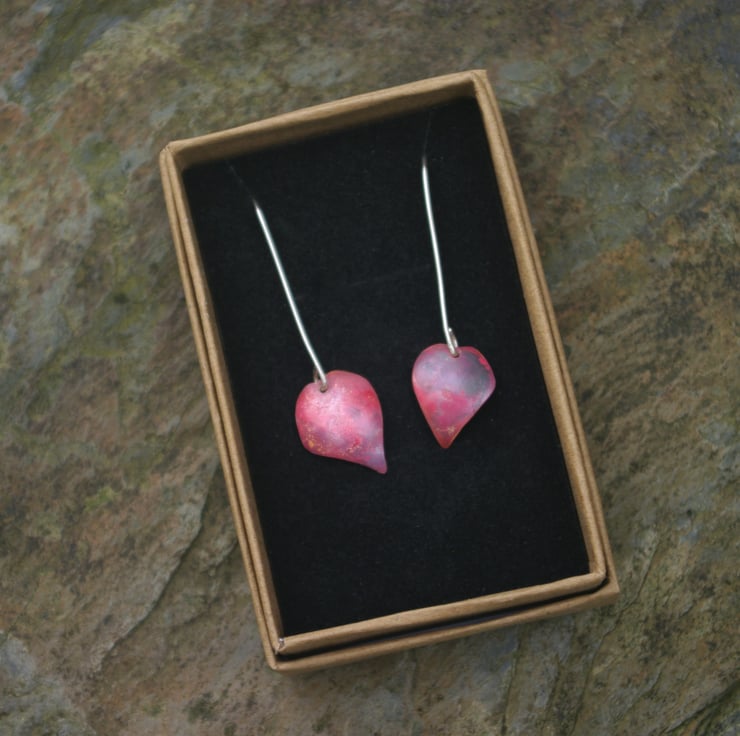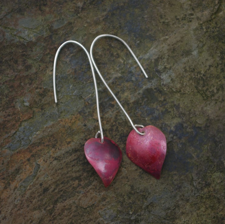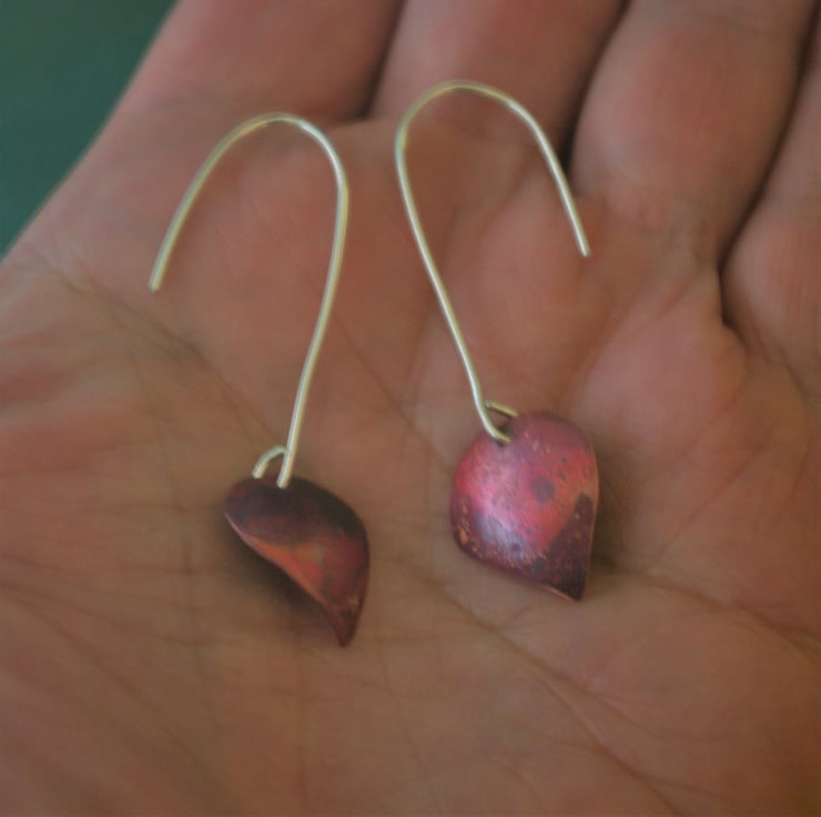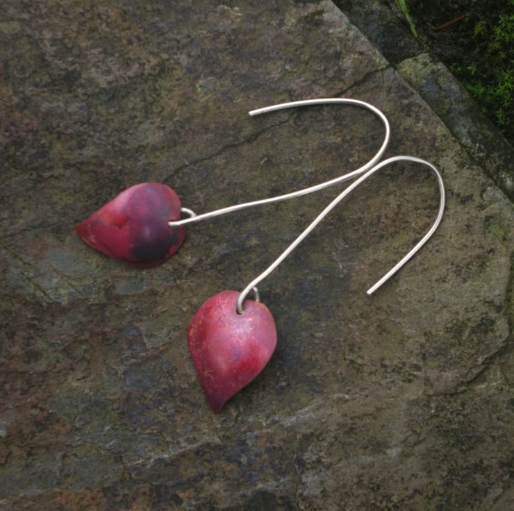 I have cut out heart shaped leaves from a piece of copper and given them a slight curve.They have luscious red hues and a textural surface through a technique using heat and hang from a handmade sterling silver ear hook.