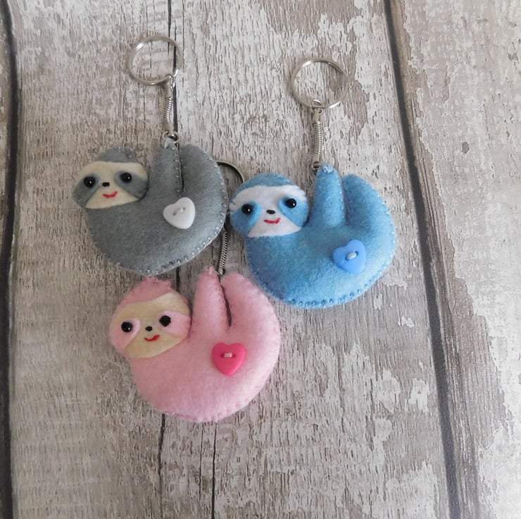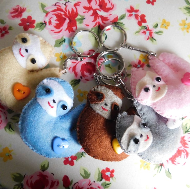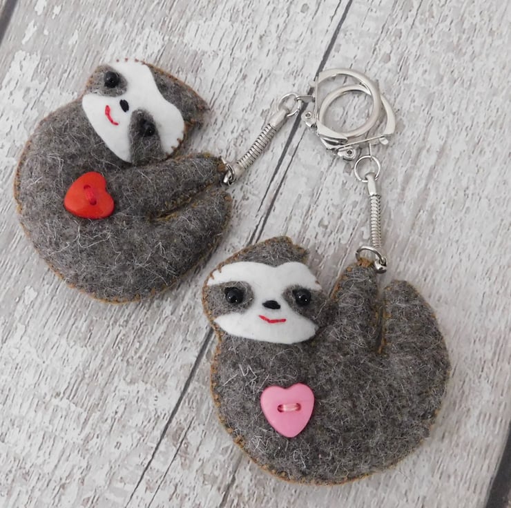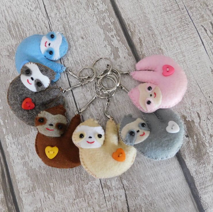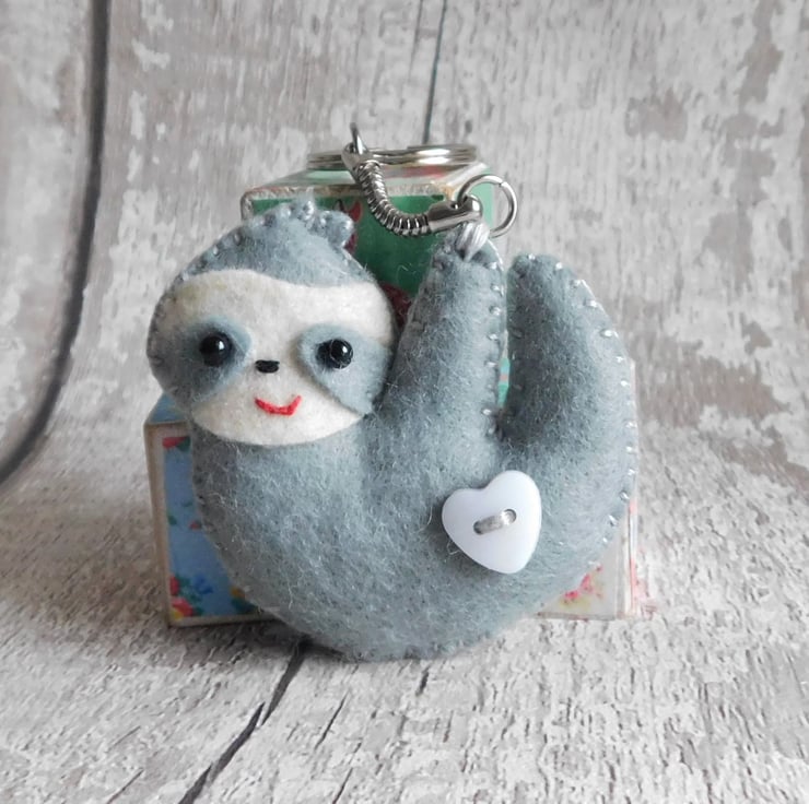The sloth is securely fixed to a metal keychain and has a heart shaped button detail. The sloths are finished with little bead eyes a perfect gift for any animal lover.
