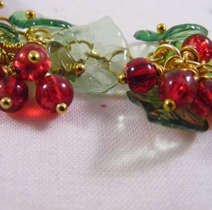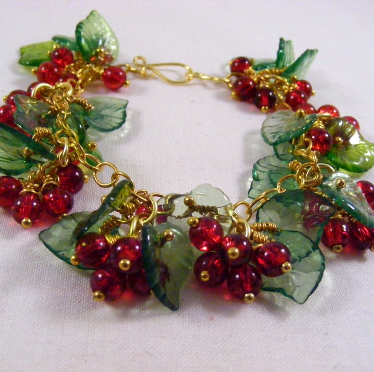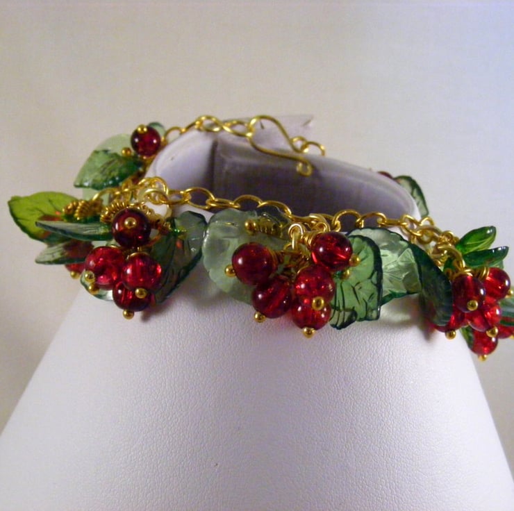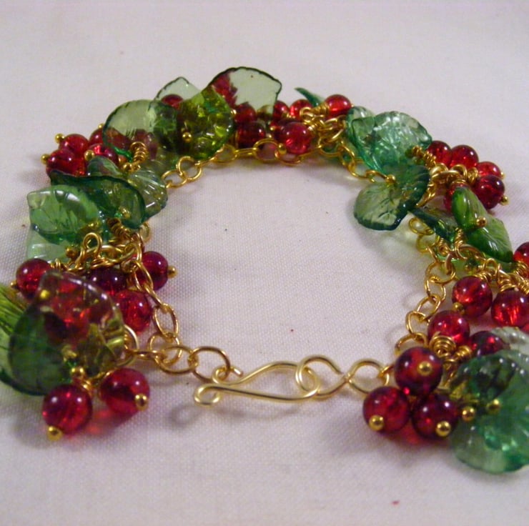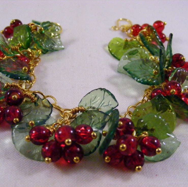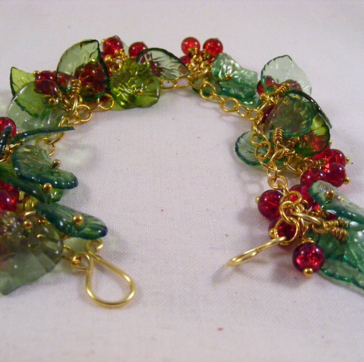 I have handmade this one of a kind Autumnal/Fall charm bracelet using, 6 mm red crackle glass round beads, 15 mm translucent green lucite leaves, Gold plated chain, headpins and wire to make the clasp.