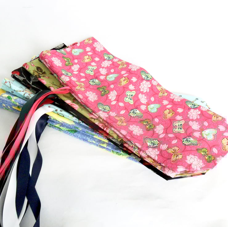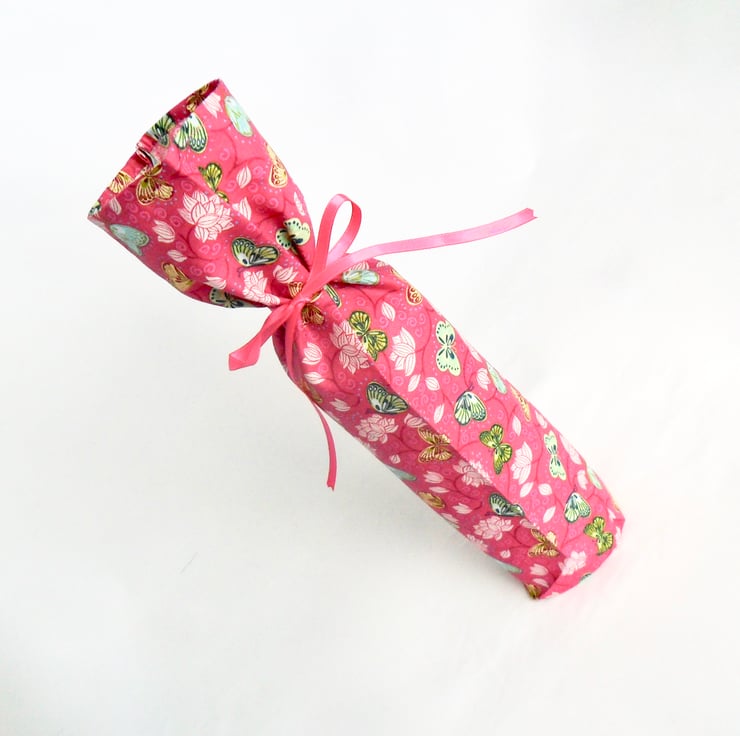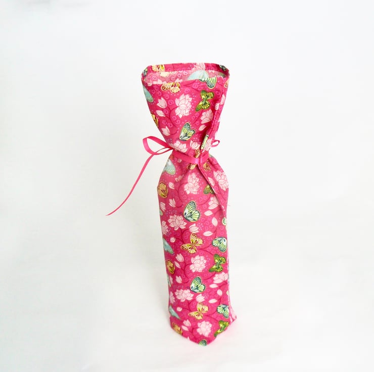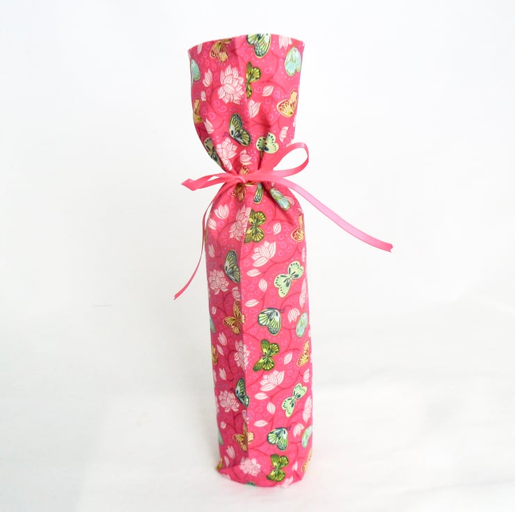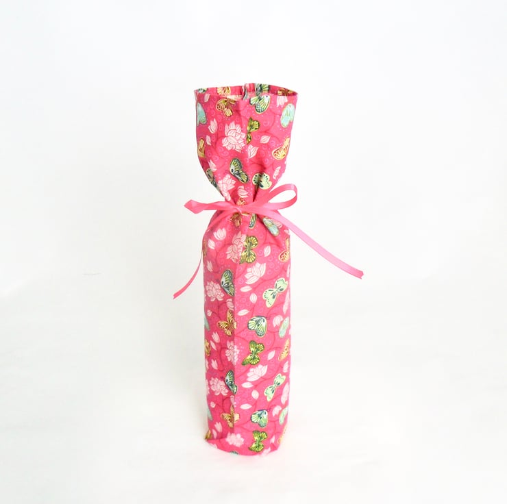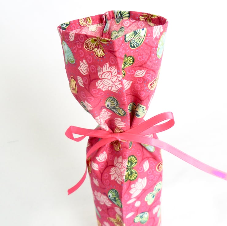 Made in a pretty pink butterfly print cotton, this gift bag is the eco friendly way to wrap. The french seams used in its construction mean that all raw edges are enclosed, giving the bag a longer life. Simple to use, you just pop the bottle into the bag and tie the attached pink ribbons into a pretty bow!
