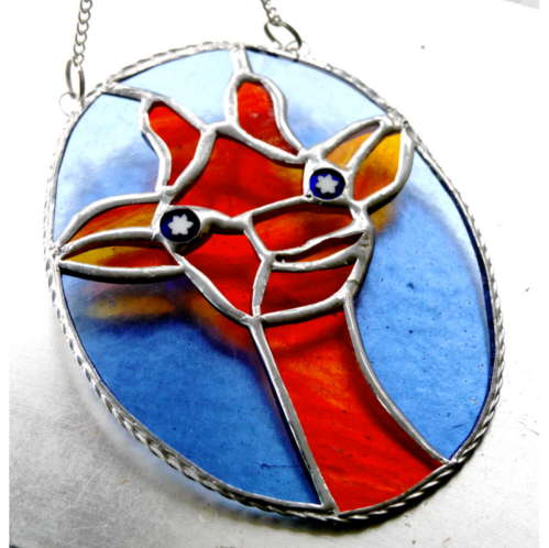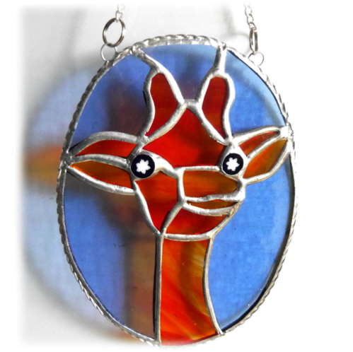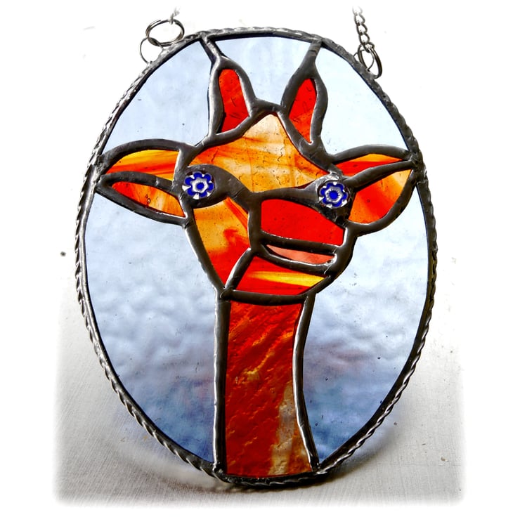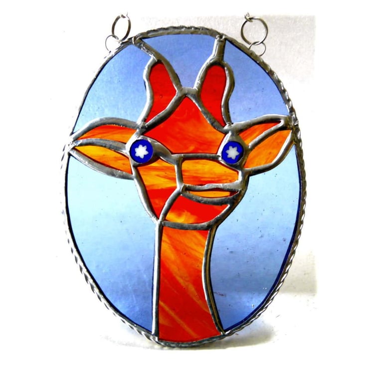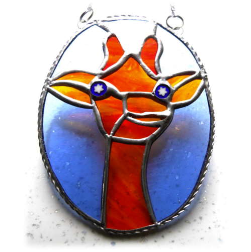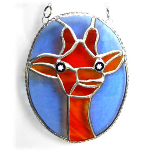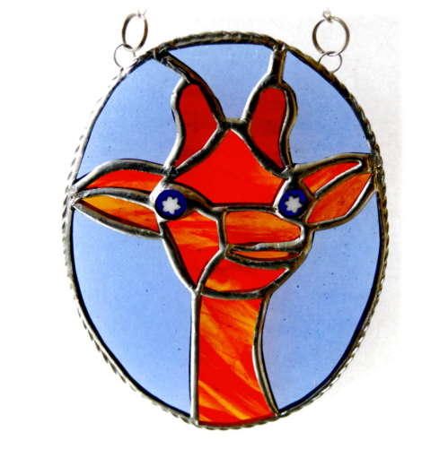 I designed it by finding a picture of a happy looking giraffe, just neck upwards, traced it and then enclosed it in a medallion of blue, gently textured glass, as an African safari sky.