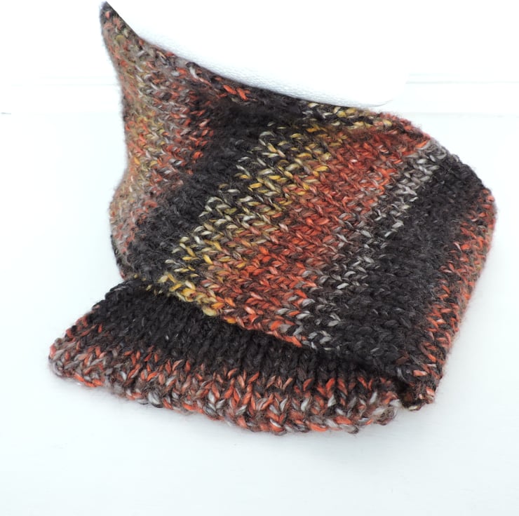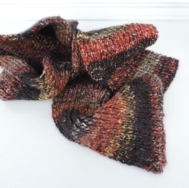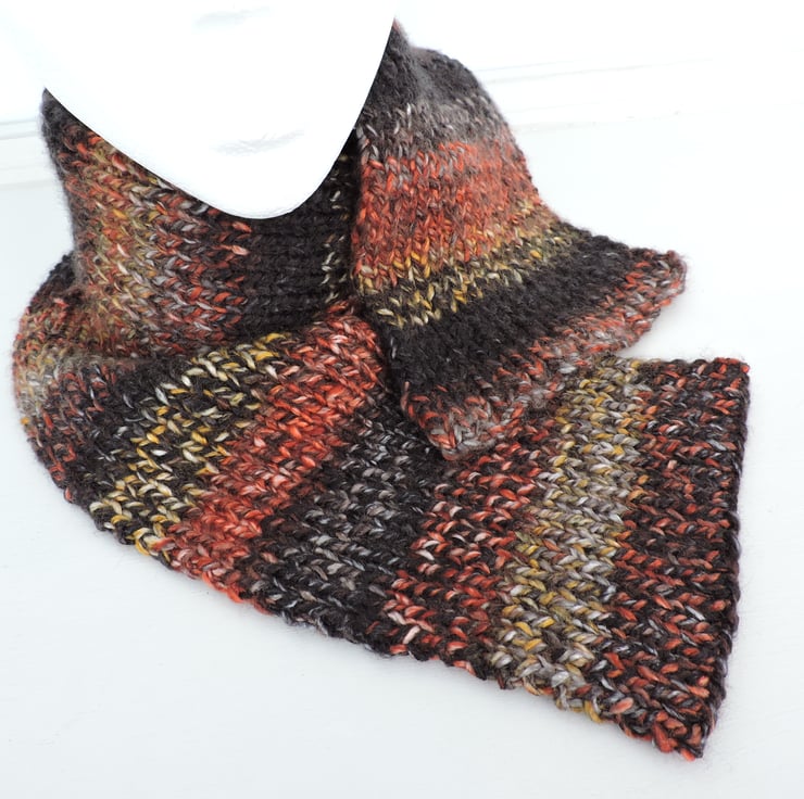 This autumnal coloured scarf has been knitted in a rib pattern with a chunky acrylic yarn. Multi tonal graduated colours of black, copper and saffron. Super soft and cosy winter warmer to keep you snug in the colder weather.