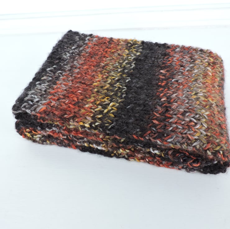 This autumnal coloured scarf has been knitted in a rib pattern with a chunky acrylic yarn. Multi tonal graduated colours of black, copper and saffron. Super soft and cosy winter warmer to keep you snug in the colder weather.
