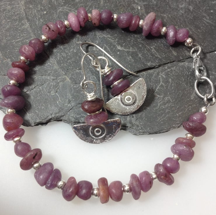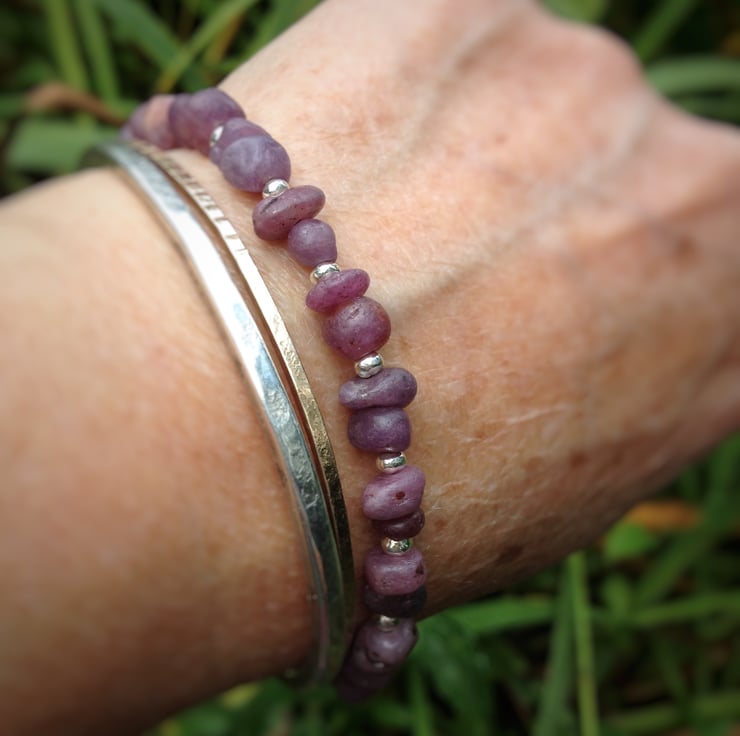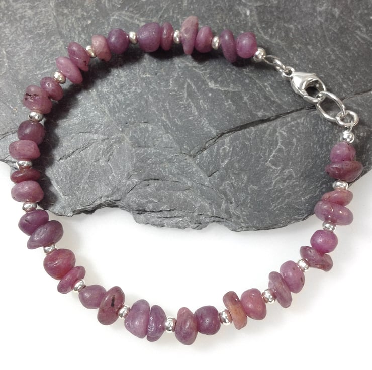 Hand cut pink ruby beads have been combined with bright silver in this bracelet.