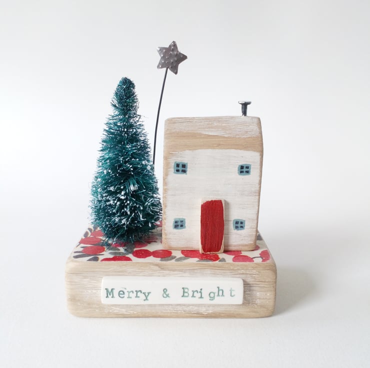It sits on a sanded, painted and decoupaged oak wood block and on the front there is a tiny clay sign with the words 'Merry & Bright'