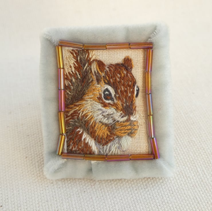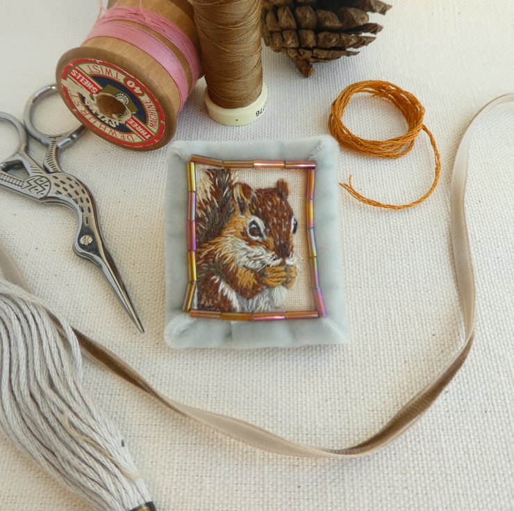 The busy little squirrel has been hand stitched with strands of thread onto a little piece of linen. The whiskers are silver thread which glint in the light, and the squirrel's eyes are alertly watching while the little hands clasp a piece of something yummy.