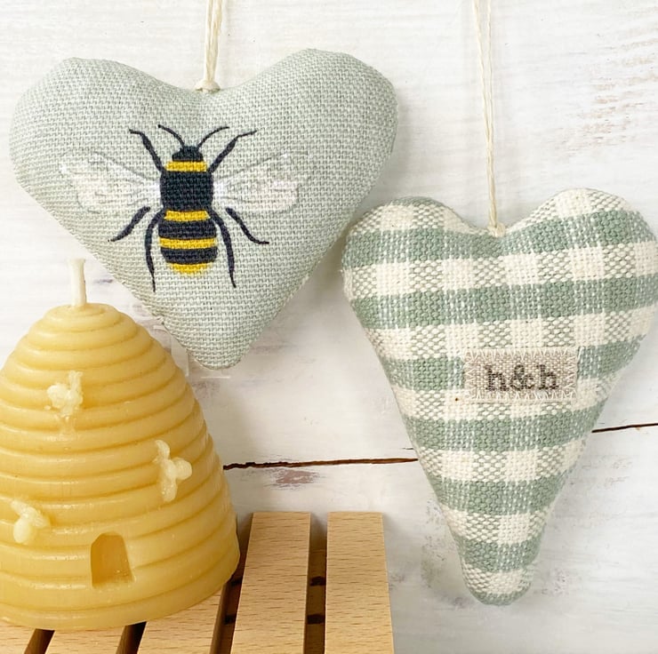Bees and gingham and checks marry together in this pretty little lavender heart. Filled with locally grown and beautifully fragrant Hampshire lavender, featuring a bee on one side and gingham on the reverse and are finished with a natural hemp twine hanging loop and a linen 'h&h' label.