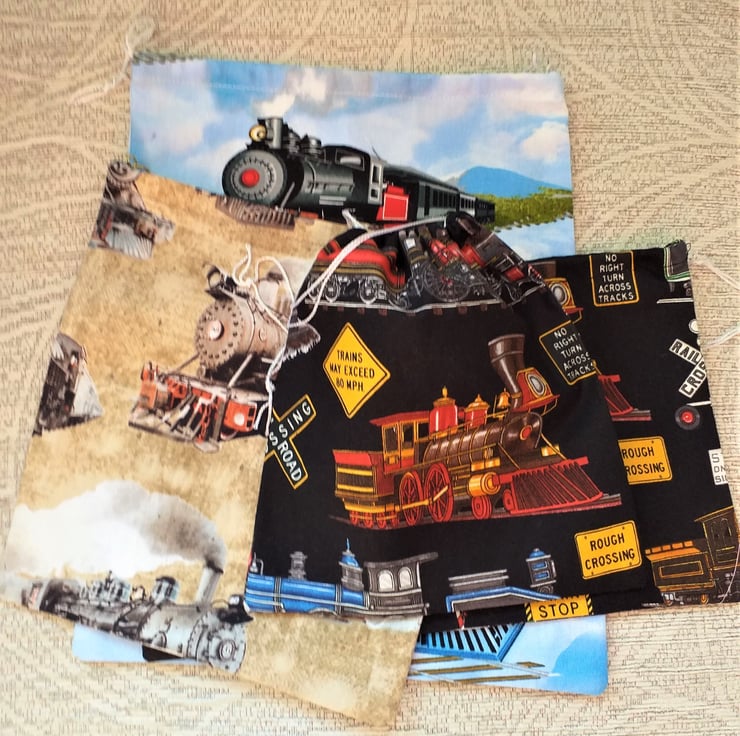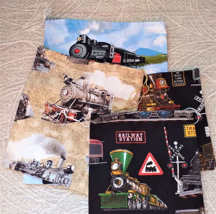 This is an assortment of bags of different sizes and colours all depicting trains, to make a little boy's gifts even more special - or, for that matter, presents for a railway enthusiast of any age. They are 100% cotton, washable and reusable, either to wrap further gifts, or as treasure bags, marble bags, bags for Scrabble letters... In this set, the largest bag measures 10" (25cm.) x 8" (20cm.) approximately
