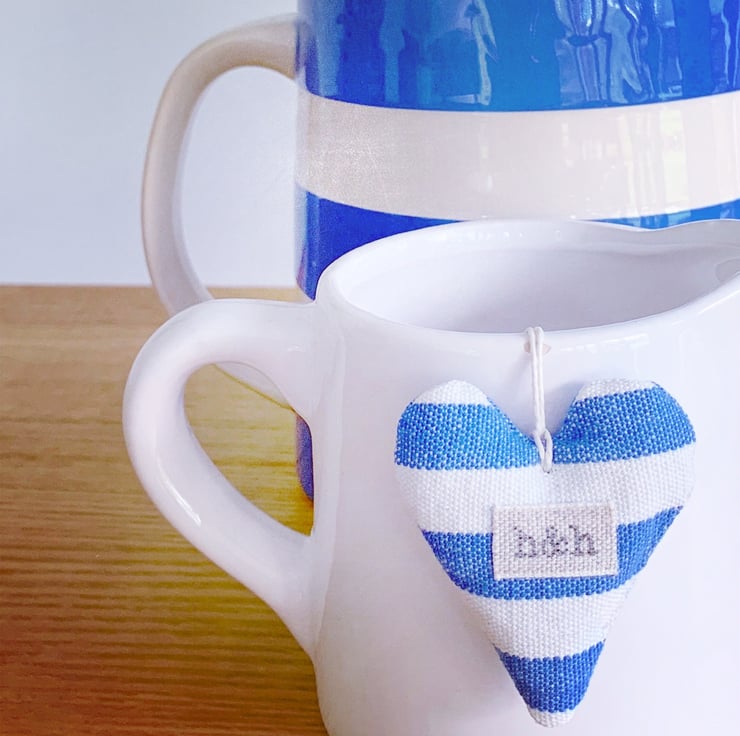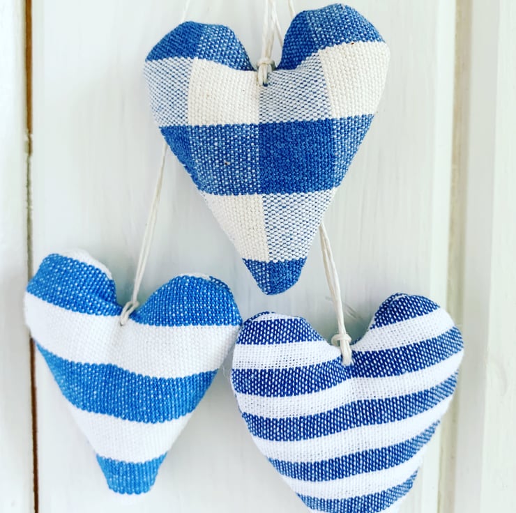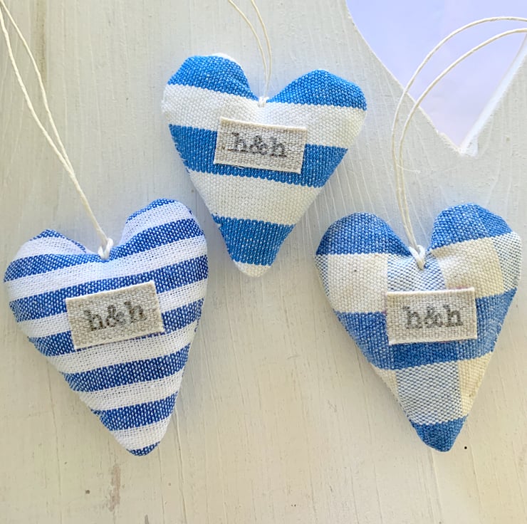 Cute as a button dinky hearts in blue and white stripes and checks. Handmade in my Hampshire garden studio, the three hearts are filled with locally grown fragrant lavender (or toy grade stuffing) and are finished with a natural hemp twine hanging loop and a linen 'h&h' label.