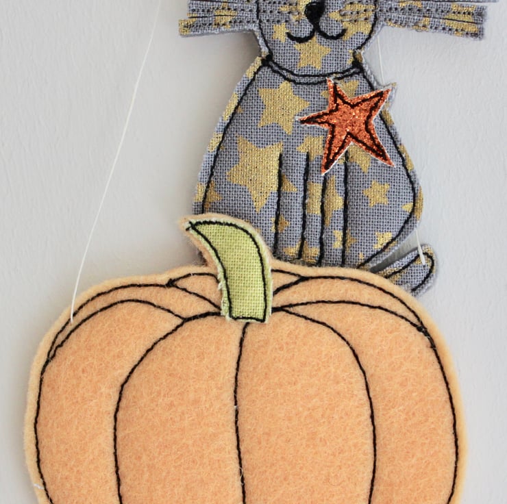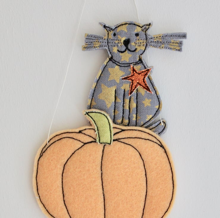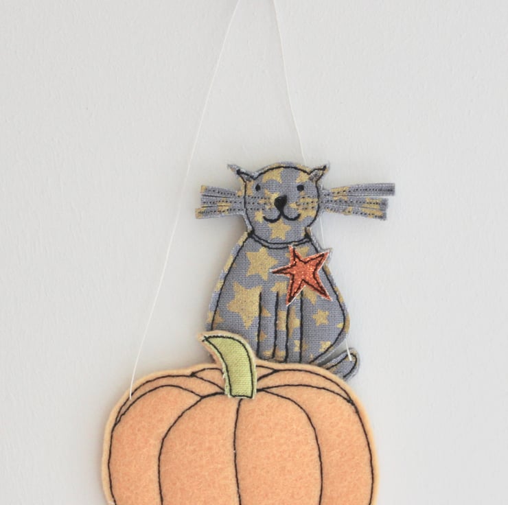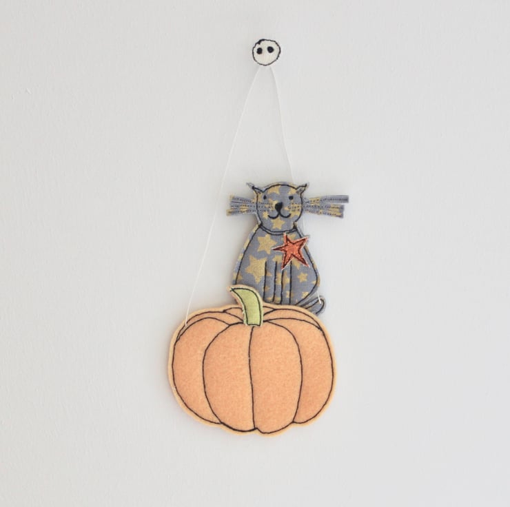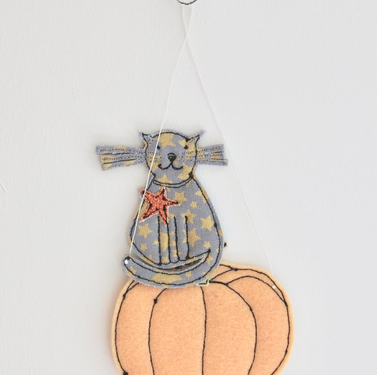 Little cat and pumpkin are sewn using cotton cloth, 100% wool felt, glitter cloth and free hand machine embroidery; multiple layers of cloth are sewn together and cut out by hand using very sharp scissors. With a linen string to suspend.