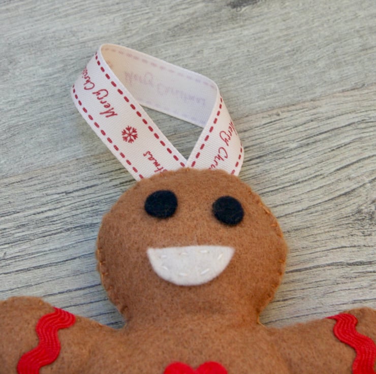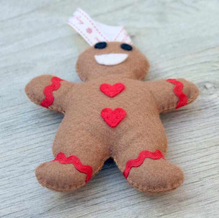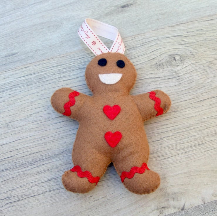 The Gingerbread Man is approximately 15cm tall (not including loop hanger) and made of wool blend felt with heart shaped felt pieces sewn on to resemble buttons. The loop is made with Christmas ribbon and is approximately 6cm. He also has cotton Ric-Rac wrists and and ankles.