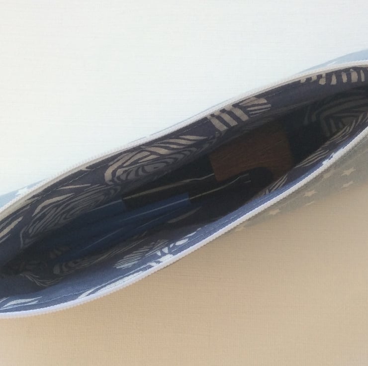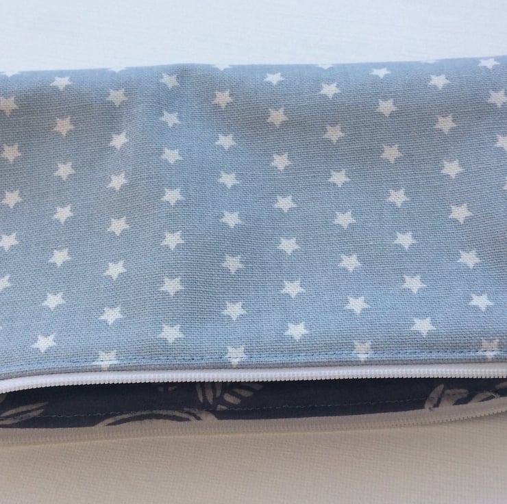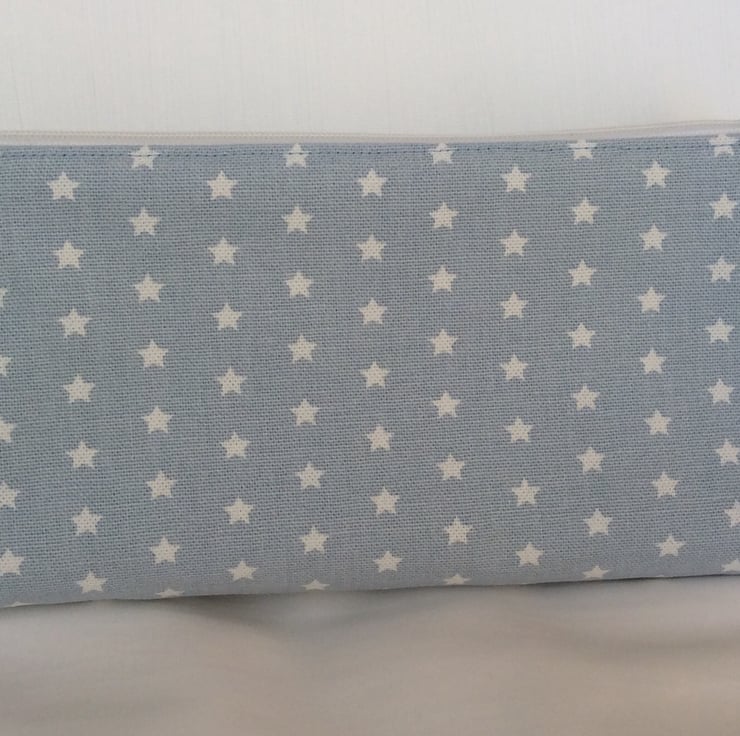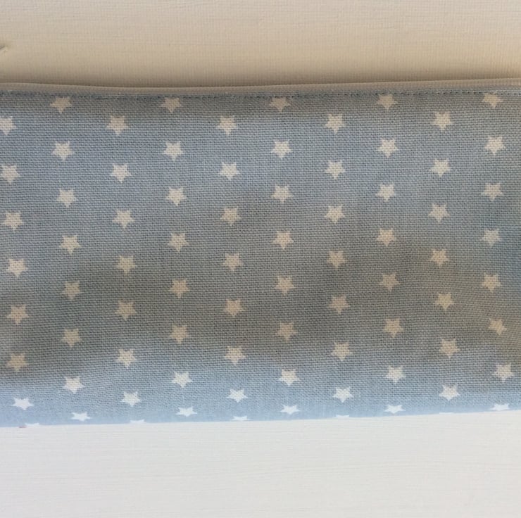 This multi functional zipped bag would be perfect for make up and is large enough for toiletries. It is made from a cotton fabric, with white five pointed stars on a baby blue background. It has a white zip. The lining is cotton, blue with a white floral pattern. The bag measures approximately 22cm x 10cm x 5cm at the base. The bag is squared off at the corners so that it will stand up.