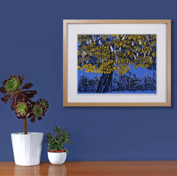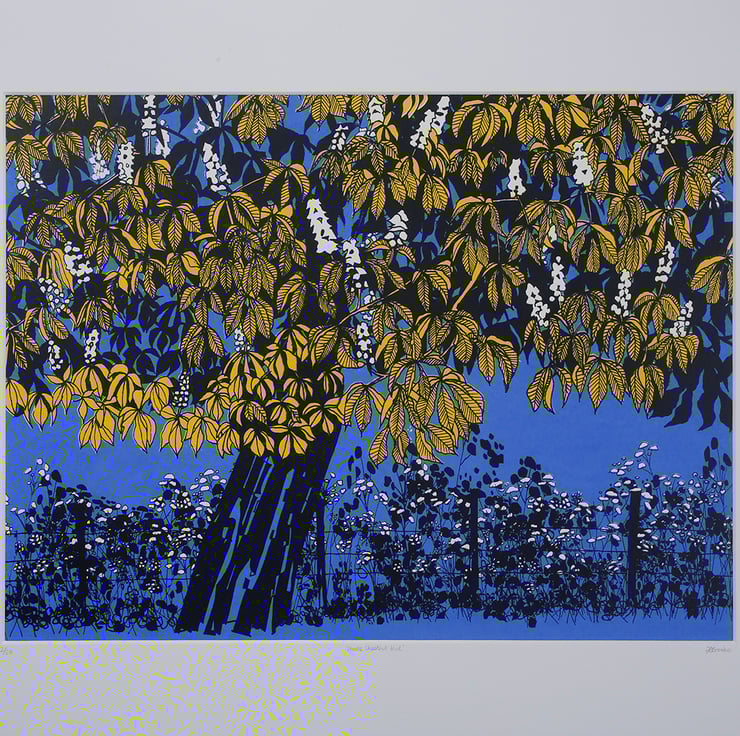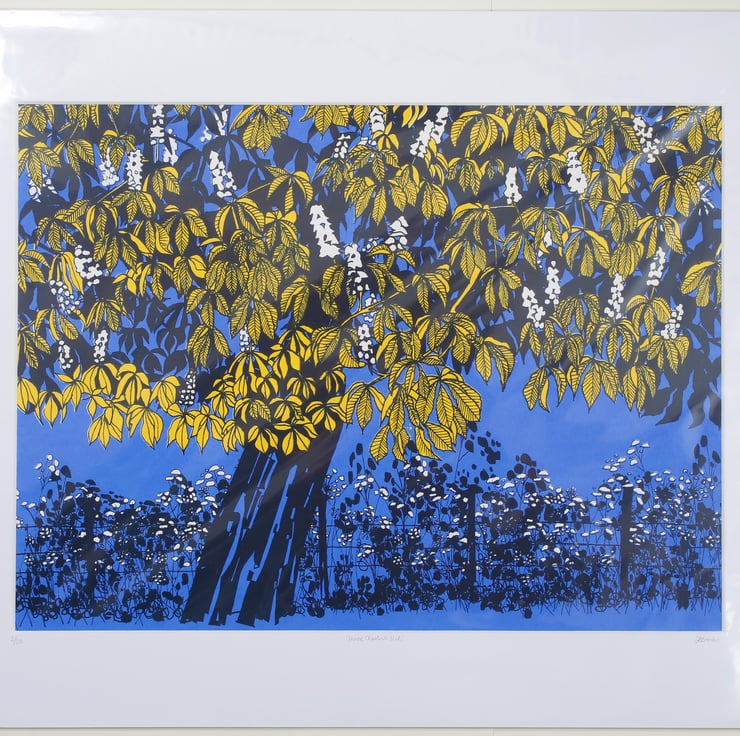 A hand-pulled screen-print called ‘Horse Chestnut Blue’.