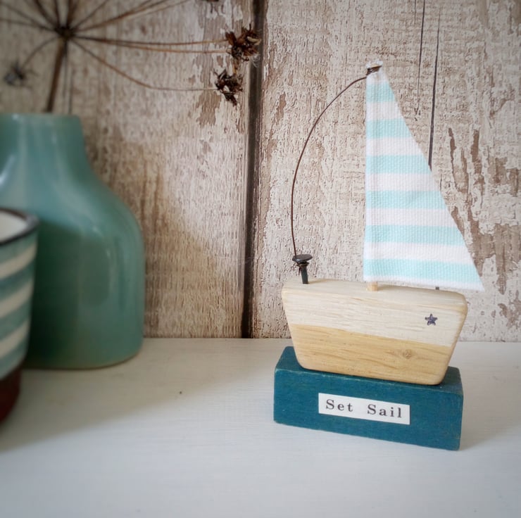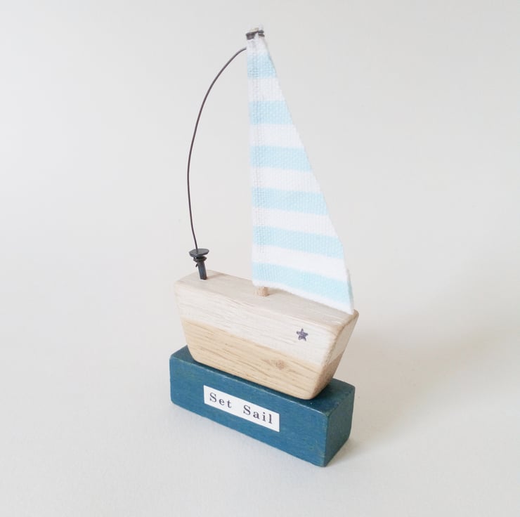 The fabric sail is wound with wire to the wood mast and the boat sits on a vintage reclaimed toy block printed with the words 'Set Sail'