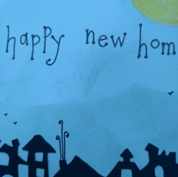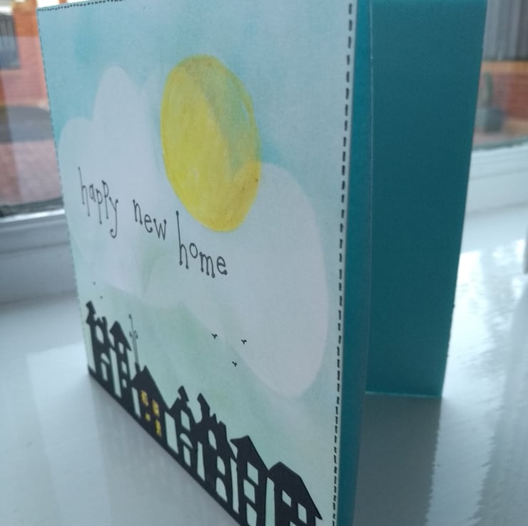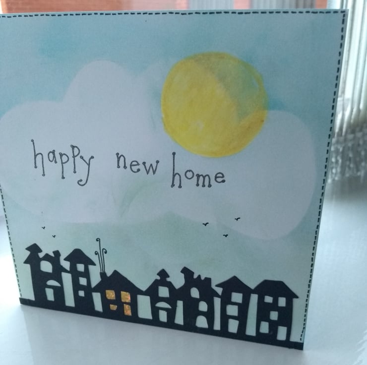 A completely handmade and uniquely designed card. Consisting of pristine quality white card which has been shaded using stamping inks with a large sun peeping from a cloud. A row of houses due cut from black card, one of which has gold windows. Happy new home handwritten using glitter gel pen