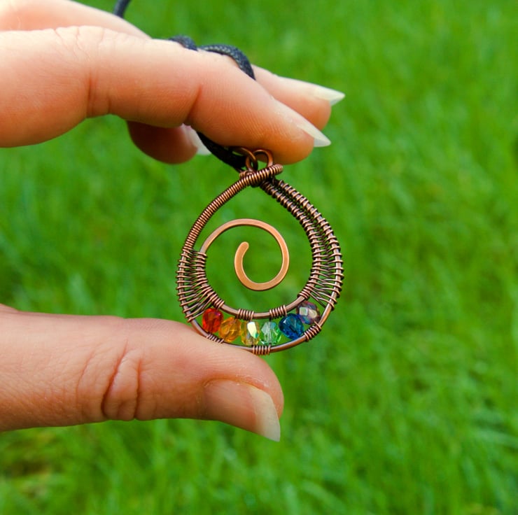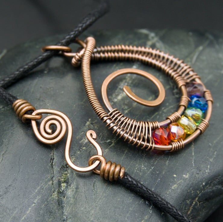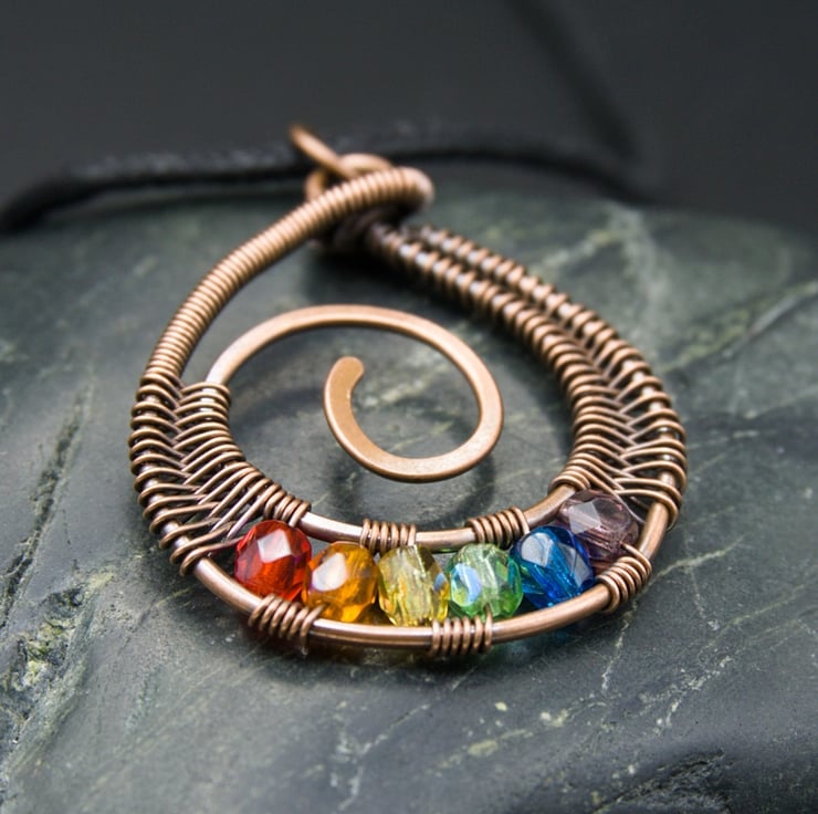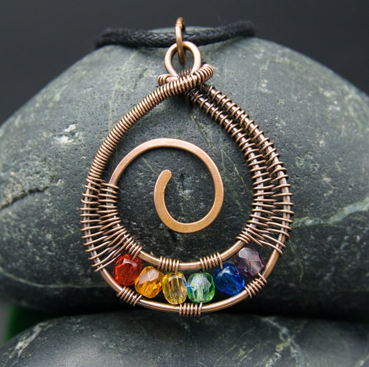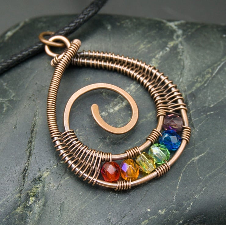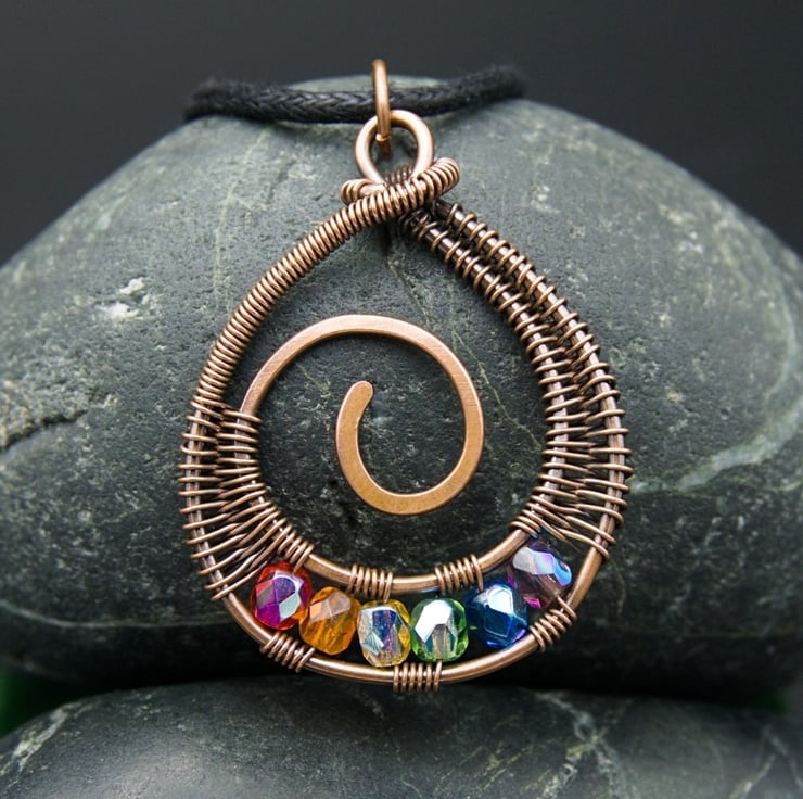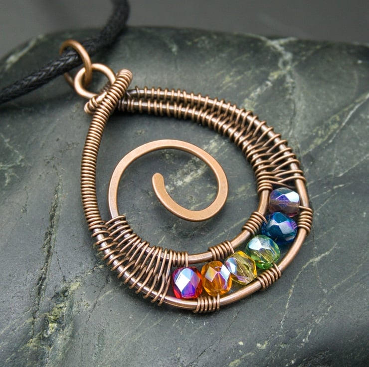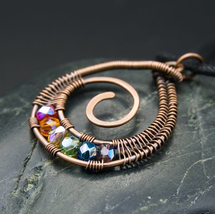 This fab rainbow pendant has been made using copper wire. I've hammered a central spiral swirl & taken the wire around below, creating a gap which I've filled with basket weave & six small faceted glass beads in rainbow colours. The beads have a half AB finish, giving a bit of mirror shine & a little sparkle as the light catches them. They can be spun around to show either the plain or the mirrored side. The other side of the pendant is finished with a simple coiled wire which wraps around the bail.