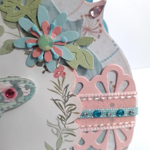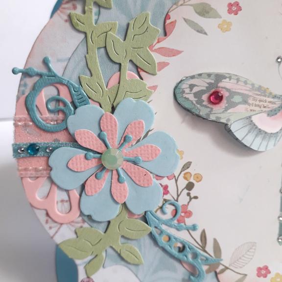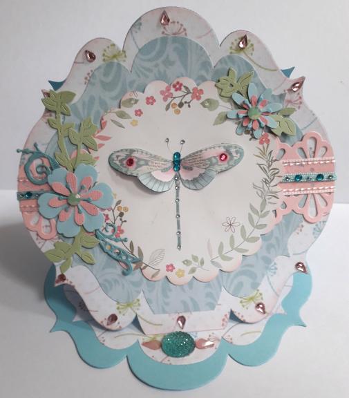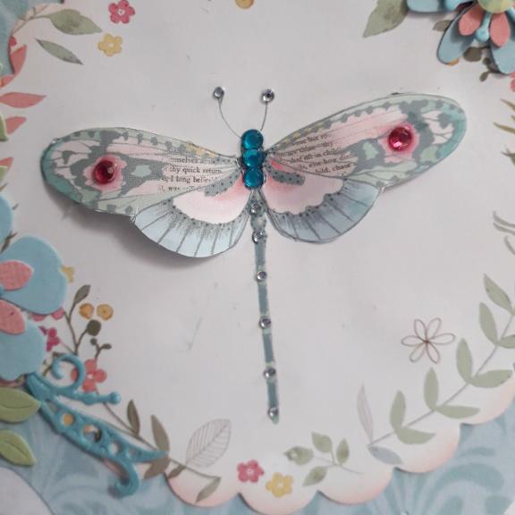 The dragonfly on this card has raised 3D wings and is decorated with gems, the topper is on a blue patterned layer, then a floral patterned background, the base card is light blue. I have added a pink die cut strip with ribbons across the middle, and gems and die cut flowers and foliage to further embellish.